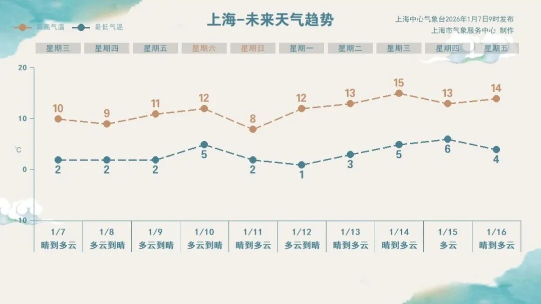 上海中心气象台预计,明日受弱冷空气扩散影响,天气以多云为主,日最高气温小幅下调至9℃。结合最新的气象资料分析来看,下周天气预测有了新变化,由于下周冷空气活动总体较弱,天气将主打回暖。另外,未来十天本市晴多雨少,防火安全不能松懈。