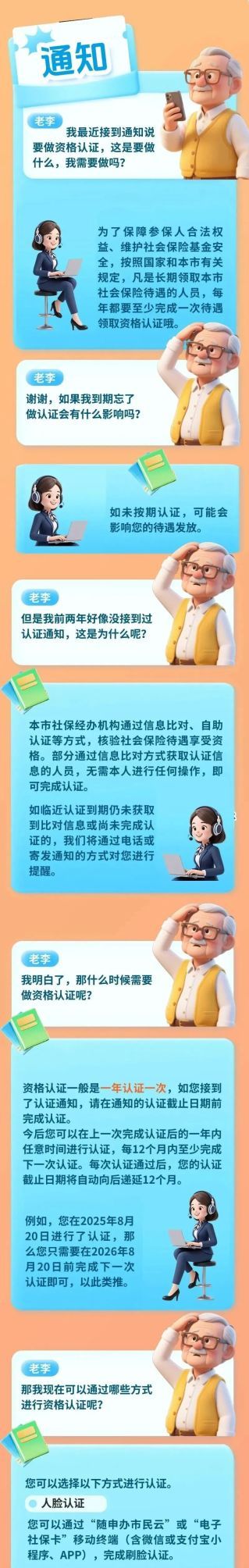 市人社局介绍,为了保障参保人合法权益、维护社会保险基金安全,按照国家和本市有关规定,凡是长期领取本市社会保险待遇的人员,每年至少完成一次待遇领取资格认证。来看详情↓