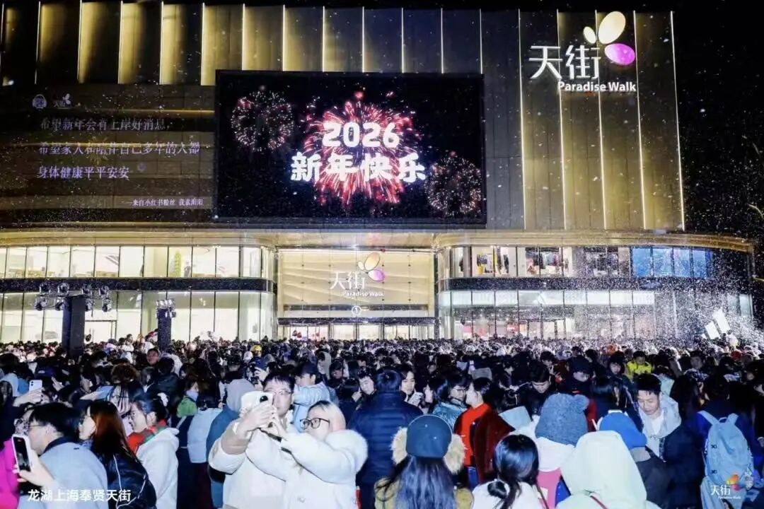 2025年12月31日深夜,龙湖奉贤天街外广场,近千名市民游客齐聚于此。零点将至,伴随着全场整齐的倒计时呐喊,气球腾空而起,欢呼声划破夜空。“很热闹、很有氛围感的跨年!”一位与朋友同来的年轻人激动地说道。这场围绕“告别、陪伴、新生”情感主线打造的跨年活动,通过整点飘雪、心愿投影、大屏抽奖等沉浸式互动,吸引了超万人次参与。商场营业时间首次延长至次日凌晨,并贴心地为零点后离场的顾客提供免费停车券,单日客流突破8万,销售额近千万,成功定义了奉贤商圈跨年新范式。