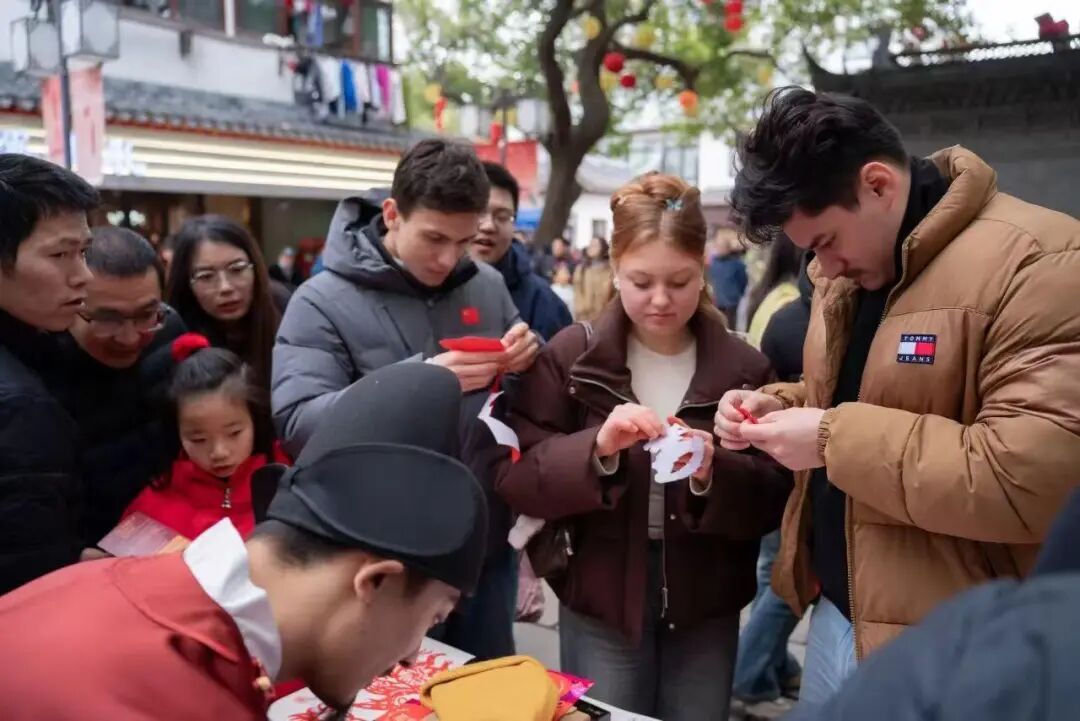 浓郁的本土年味与跨文化交融成为亮点。“贤城味道”食集上,鼎丰乳腐、庄行羊肉等传统美食与网红咖啡并肩。来自华东理工大学的外国留学生们沉浸其中。“文化的魅力跨越了语言,这是一次非常特别的体验!”一位留学生兴奋地表示。