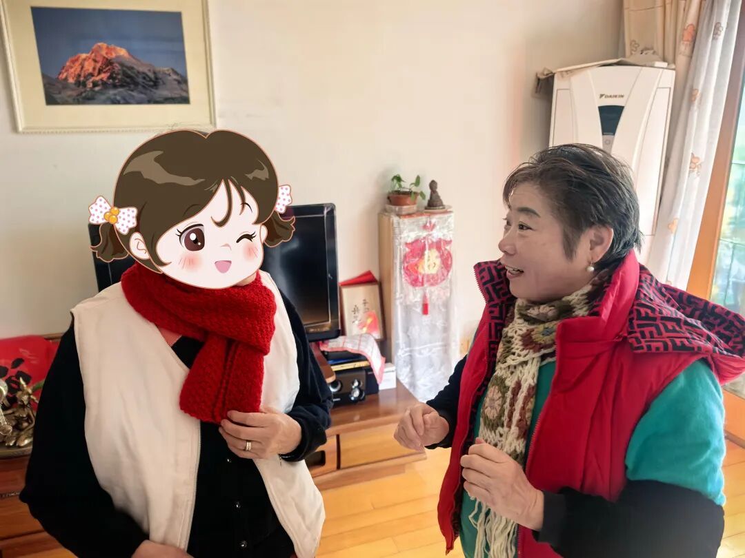 围巾织好后,在居委社工的细致协调与全程陪同下,志愿者们分组行动,敲响了一户户老人的家门。一条小小的围巾,让独居老人在寒冬中感受到了“社区如家”的归属感与安全感,那份温润和睦的邻里情谊,也在这一来一往的关怀间愈发浓厚。