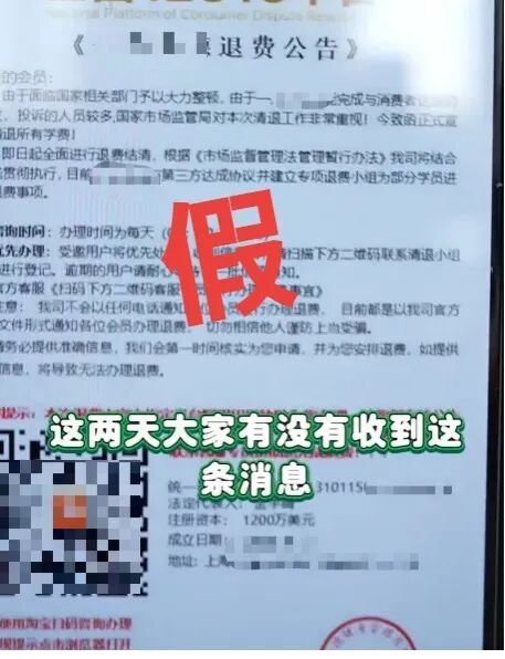 最近有上海市民称收到了 “全国12315退费公告 清退会员费”的短信和图片 12315不就是 消费者投诉举报热线吗? 这“官方”的公告是真的吗? 赶紧告诉你的爸妈和家里人 别点,别扫,别信 诈骗手法解析 以退费名义获取信任 诈骗分子通过非法渠道获取个人信息后,将伪造政府部门、公司、机构文件邮寄给受害人,以办理培训退费、投资退费为由,诱导其加入退费群。 待受害人进群后,诈骗分子通过发送营业执照、工作证,营造多人成功退费的假象来获取受害人信任,实际上这些都是假的,群里的成员也都是“托”。 小额返利先迷惑 待大额投入后“收网”诈骗 以“购买理财产品退费”“充值返利”“做任务”等理由,引导受害人下载投资理财App,并在App上充值。在前期小额投资时,诈骗分子一般会如约支付收益,进一步获取被害人信任,诱导其加大投资。 当受害人投入大额资金后,诈骗分子便以“操作失误”“账户冻结”“缴纳保证金”等理由拒绝提现,要求受害人继续投入资金,直到受害人发现被骗为止。 警方提示: 所谓的退费,其实就是诈骗分子用于引流的幌子。请大家擦亮双眼,不要轻信来历不明的文件、包裹。正规退费流程一般以原路返还的形式返还给本人缴费账号,凡是退款时附加购买理财产品或支付费用条件的,都是诈骗! 如有疑问,可及时拨打110或有关机构主管部门电话求证、求助。 综合自:新闻坊 编辑:罗时珎 转载请注明来自上海徐汇官方账号
