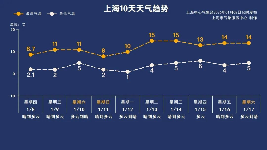 明天是一个艳阳天,晴到多云为主。早晨受辐射降温影响,气温依然偏低,市区最低气温2℃,郊区-3℃—0℃,有薄冰或冰冻,白天小幅回暖,最高气温11℃,南到西南风3—4级,沿江沿海地区4—5级,相对湿度70%—25%,体感比今天舒服一些。闵行预计明天最高气温11℃,最低气温0℃。