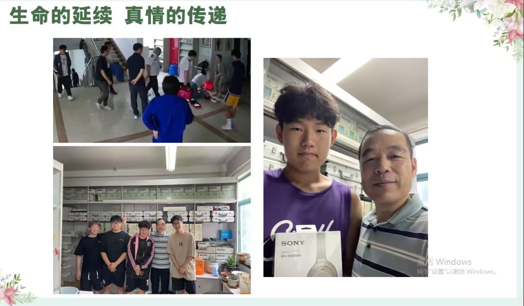 校长龚瑞华分享了一张特殊的照片,它定格了赵老师向救命恩人致谢的瞬间。去年5月的一天,赵老师在食堂用过早饭后独自走回四楼办公室,在三楼楼梯口时突感不适倒地不起。几名学生发现后,立即自发分头组织救援:去教师办公室用电话拨打120,去卫生室求援并取来AED(自动体外除颤器),到校长室紧急报告……几分钟内各方赶到现场,并使用除颤仪成功挽救了赵老师的生命。赵老师痊愈回校后看到视频非常感动,向学生当面致谢之余,还填写了“感动沪新”十大事件申报表。最终,这一事件经票选上榜。