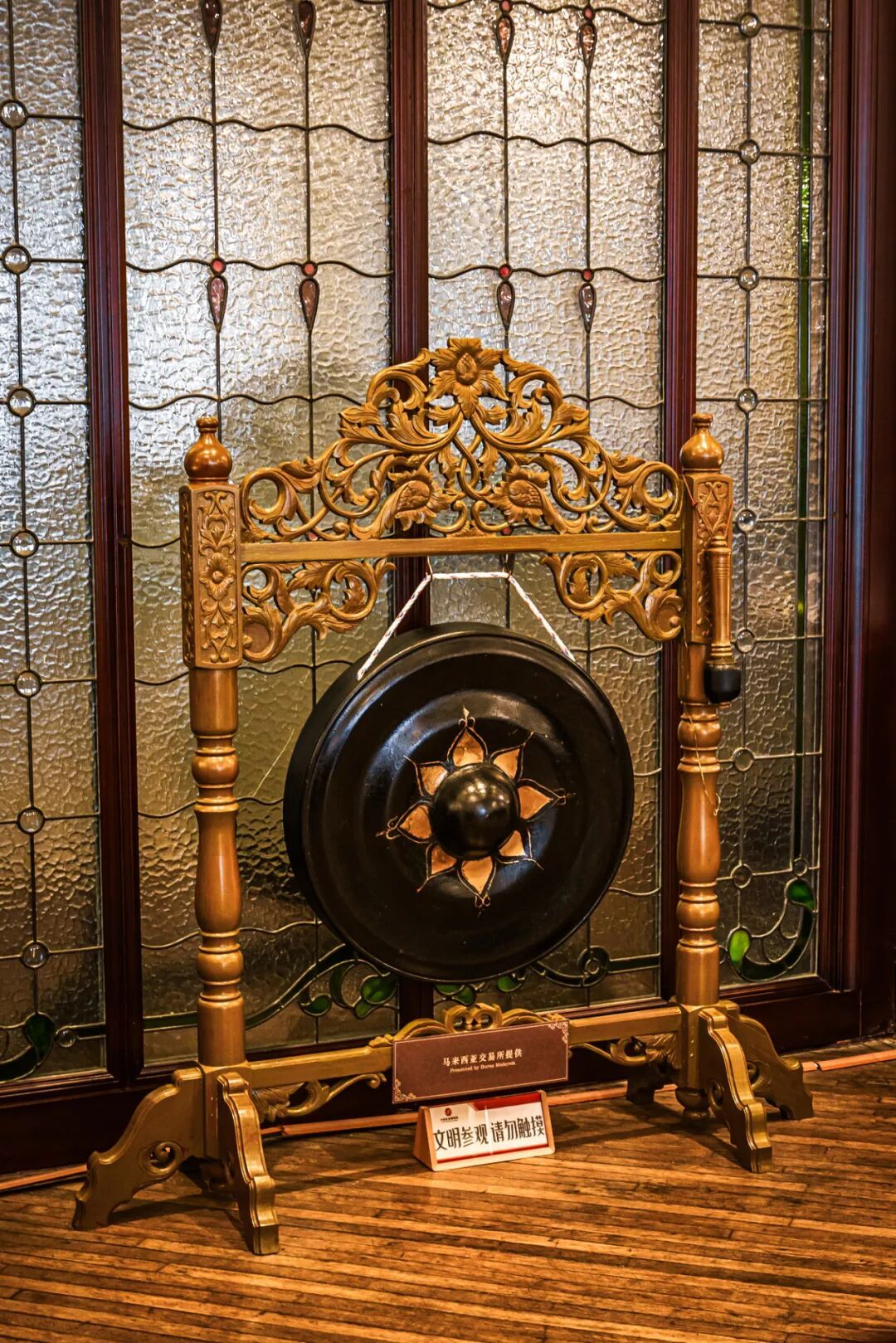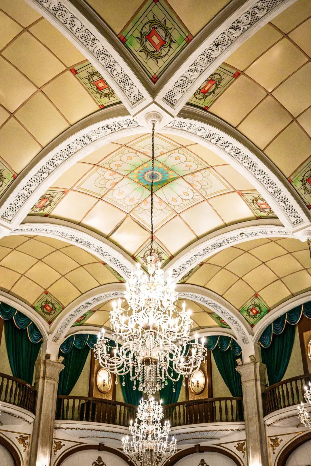 天花板才是重头戏,镶嵌的彩色玻璃像孔雀开屏般铺开,阳光透过时在整个舞厅内形成色彩斑斓的图案。