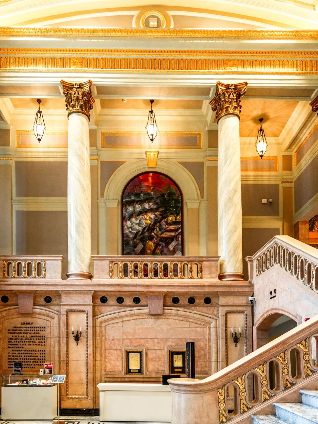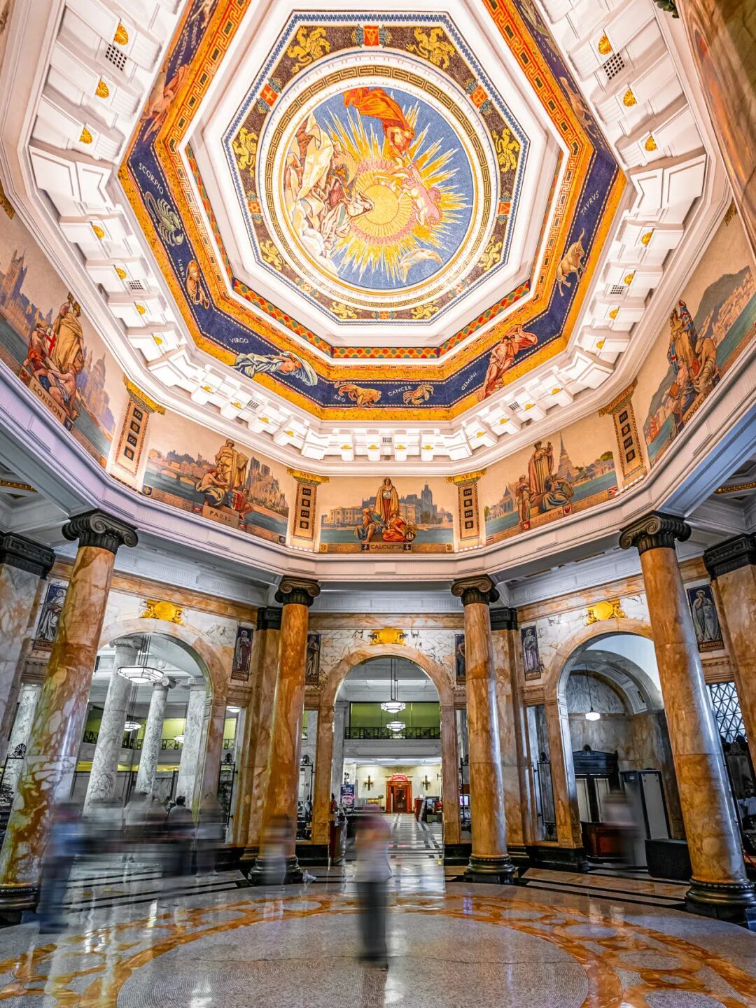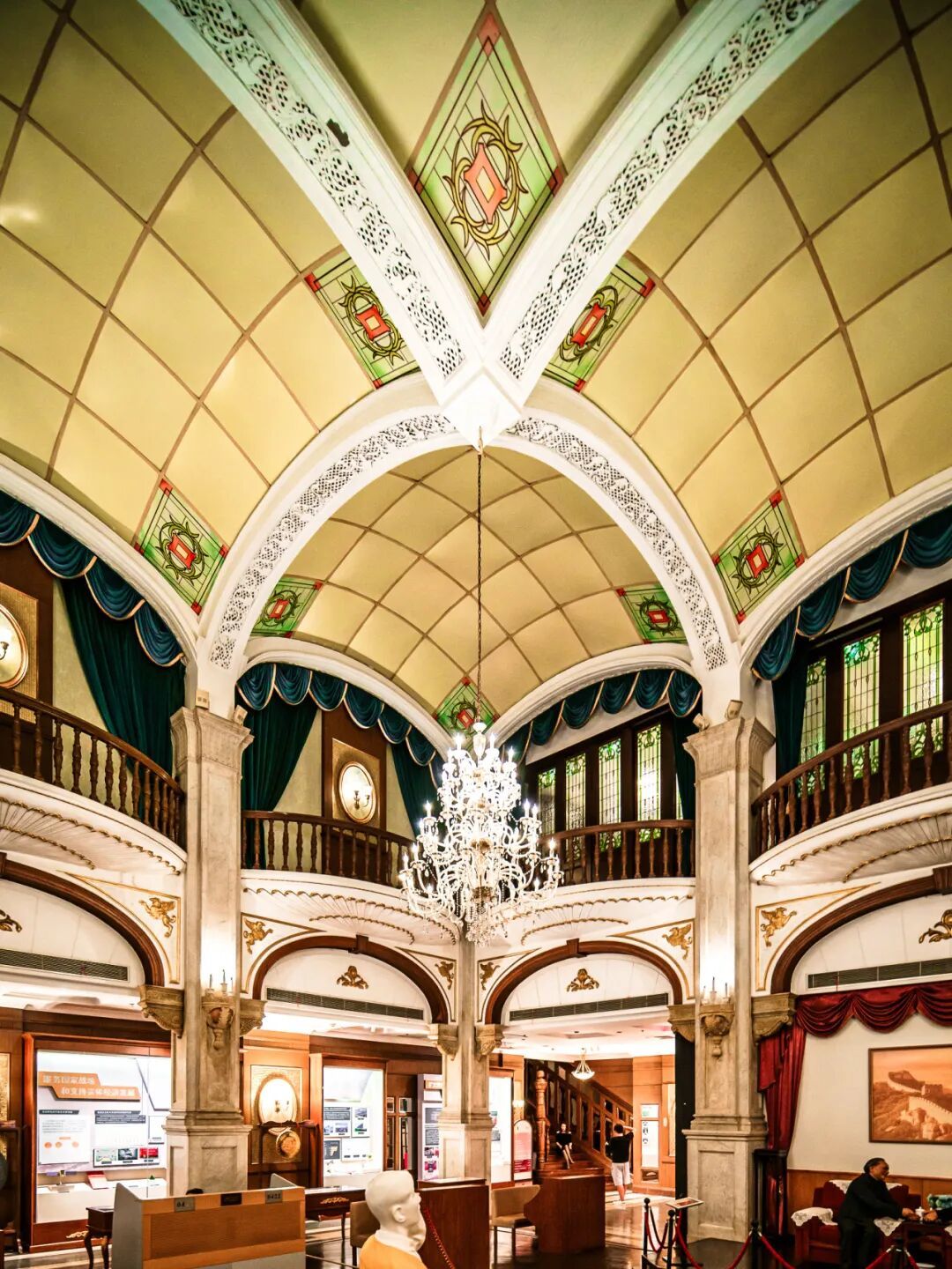推开铜门,两排气势恢宏的古罗马爱奥尼式巨柱列队而立,托举起一座令人震撼的巨型彩色玻璃天花板。