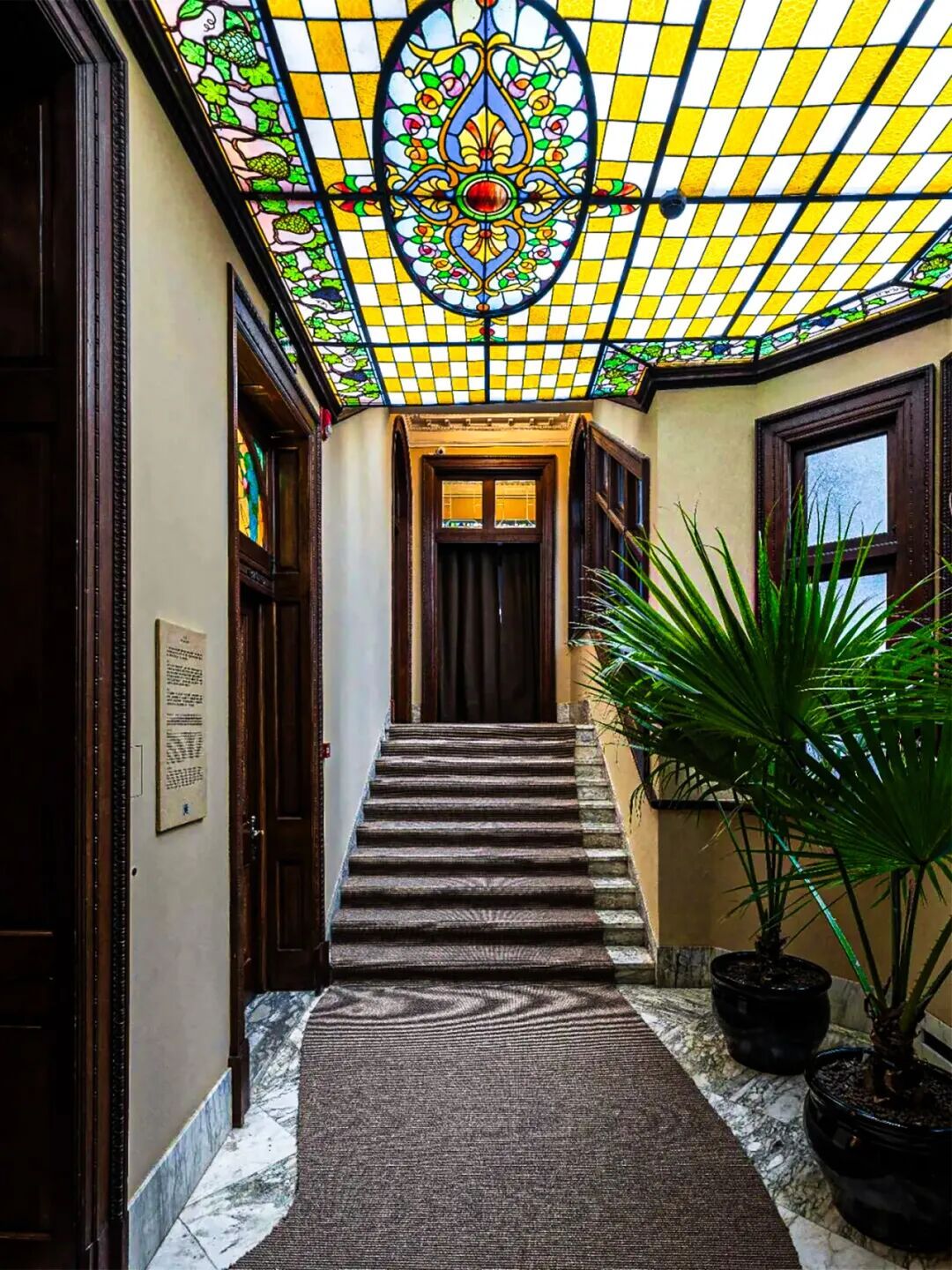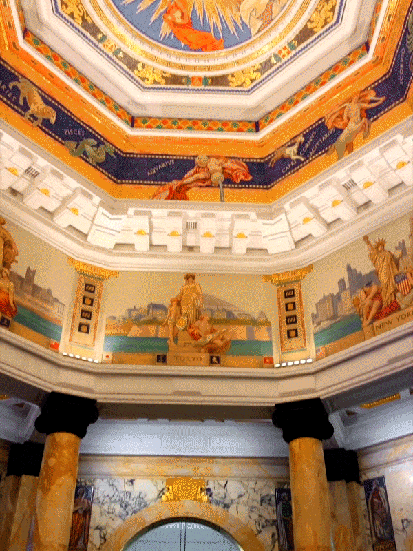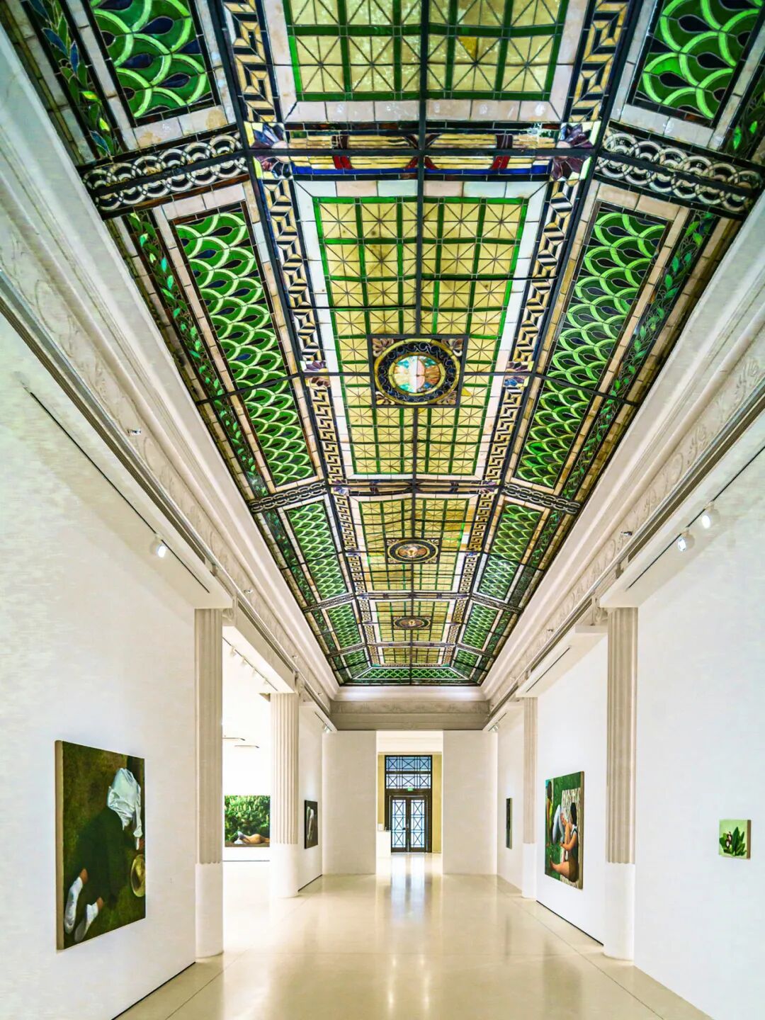 推开铜门,两排气势恢宏的古罗马爱奥尼式巨柱列队而立,托举起一座令人震撼的巨型彩色玻璃天花板。