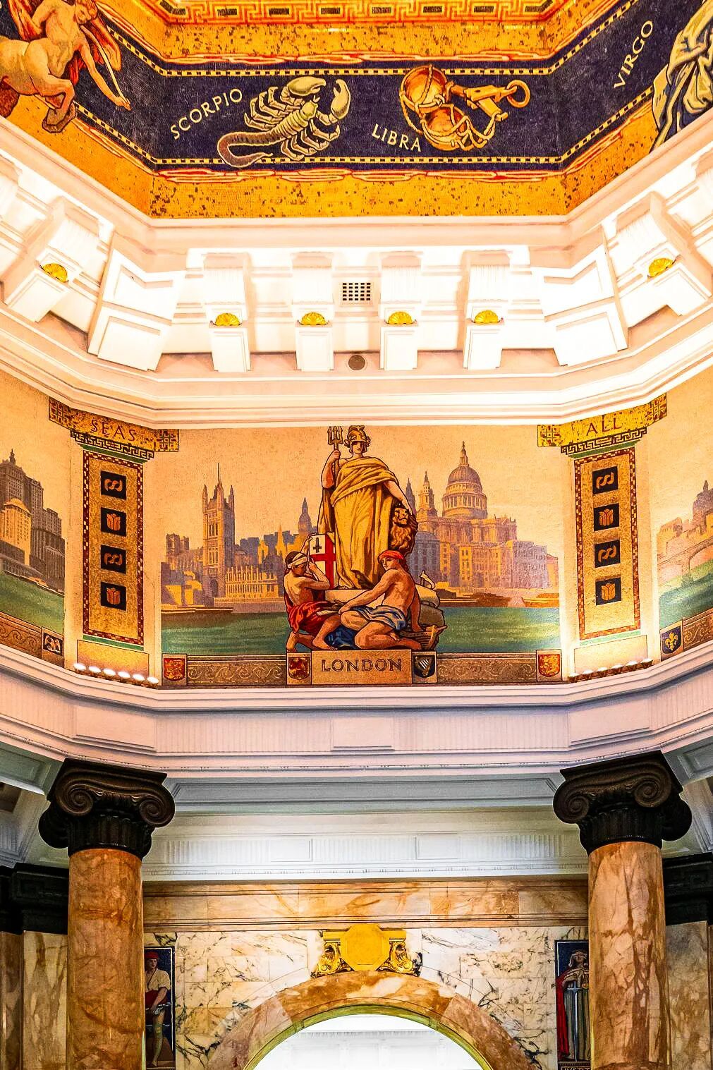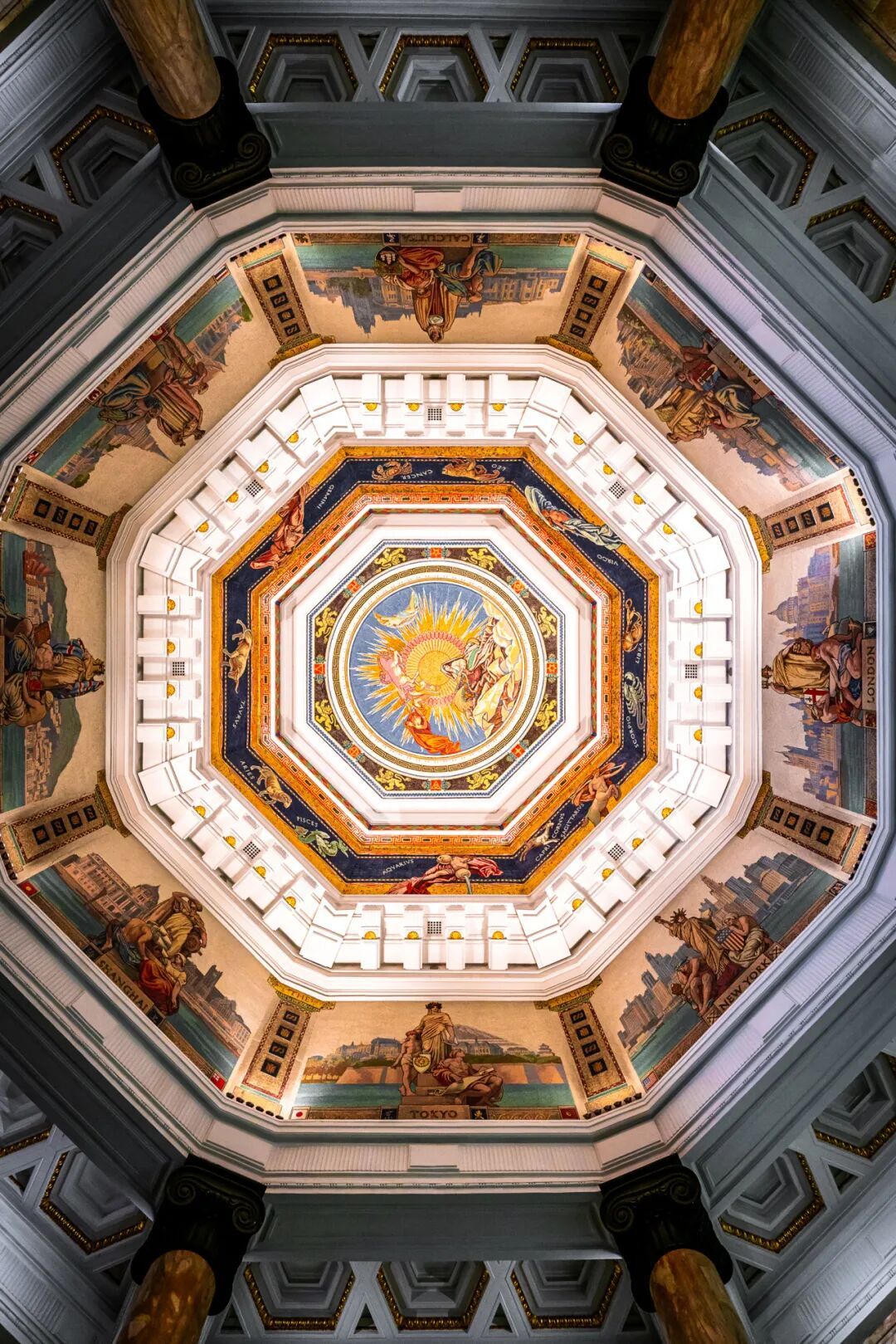 壁画共三层,上层取自古希腊神话,绘有太阳神、月亮神和丰收女神。第二层是黄道十二宫星座图,构筑日、月、星辰,天、地、人宇宙观。第三层壁画共八幅,是当时汇丰银行设在上海、香港等8个城市的分行建筑和象征城市的女神。