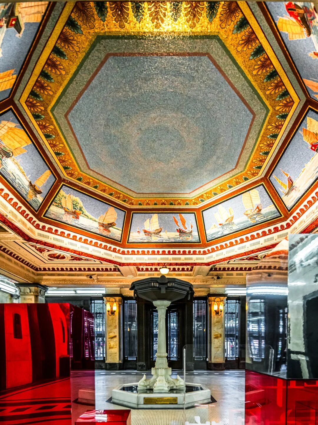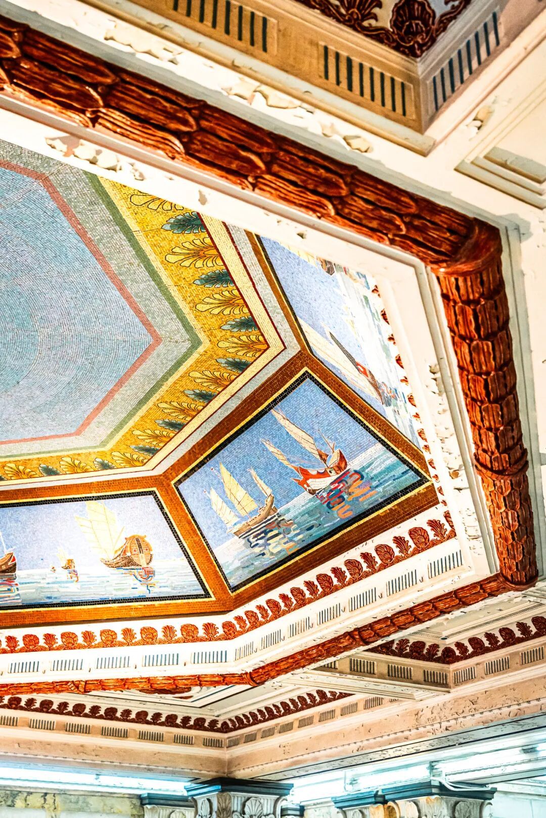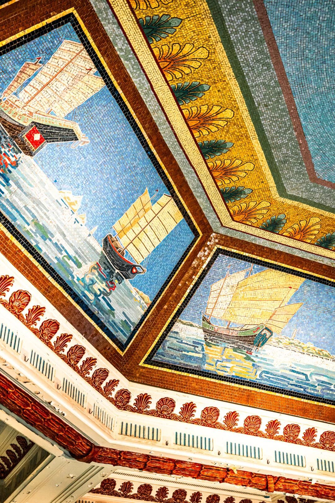 正门大厅上方的超大八角斗拱穹顶,美得让人叹为观止。穹顶八面,由数万颗彩色马赛克拼贴成8幅“帆影海事图”,刻画古代帆船航海的壮丽场景。