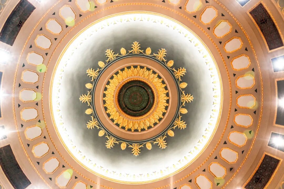 穹顶由植物元素跟回形纹构成,四周镶缀着繁复细致的石膏线花纹,要知道,此类材料大面积的穹顶在全国都极为罕见。