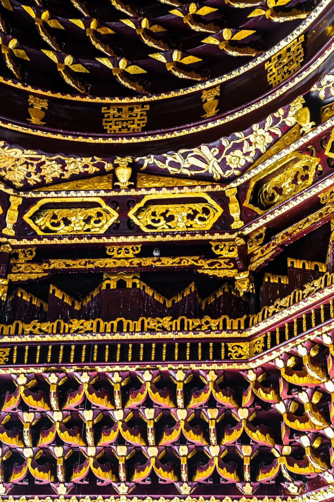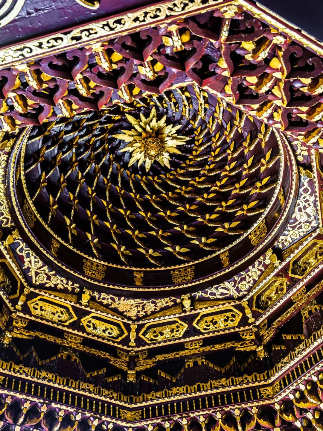 而其中最摄人心魄的,当属金碧辉煌的古戏台,以及其上那顶全木质结构的华丽藻井。