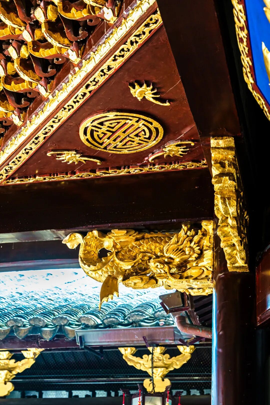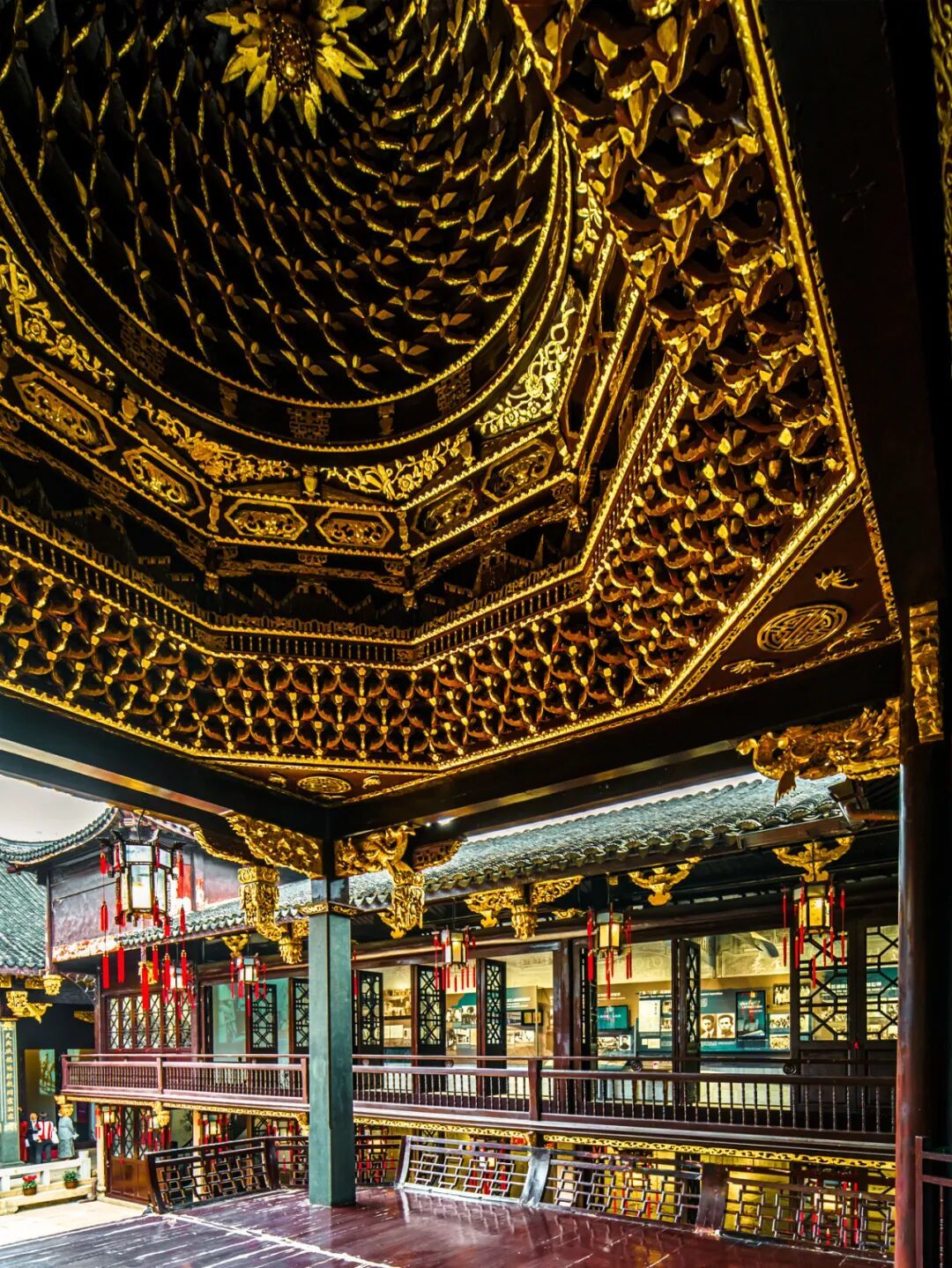 三山会馆的藻井,被誉为上海天花板中的“天花板”。它如一把撑开的金色华盖,悬于戏台之上,层层斗拱贴金,雕刻极尽精巧,仰视之间,仿佛能听见百年前的戏韵悠长。