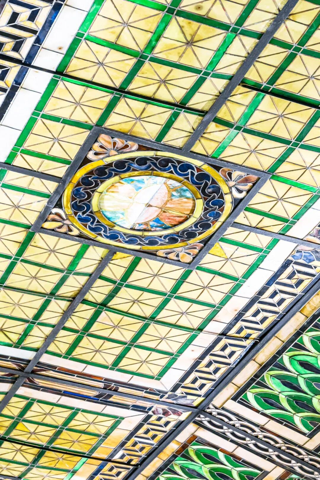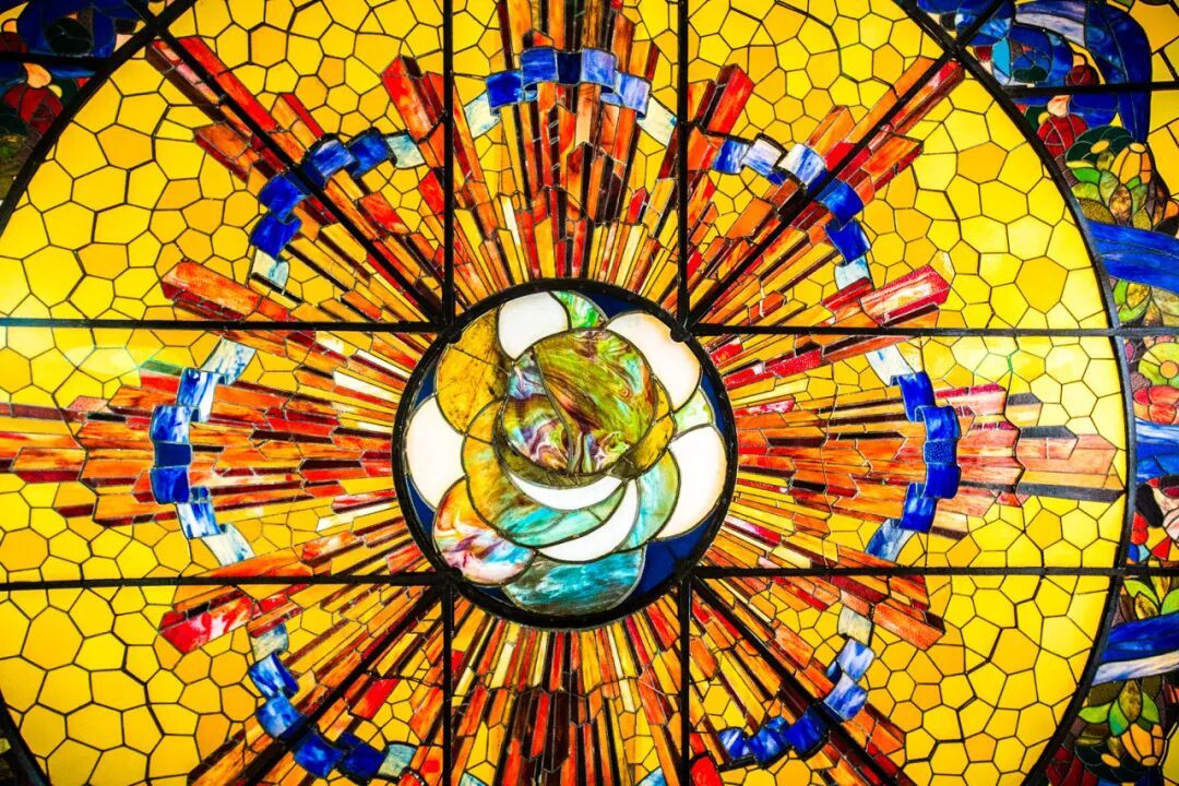 荣宅最绝的风景,藏在二楼宴会厅里——45平方米的彩绘玻璃天花板,由69块色彩各异的玻璃拼接而成。