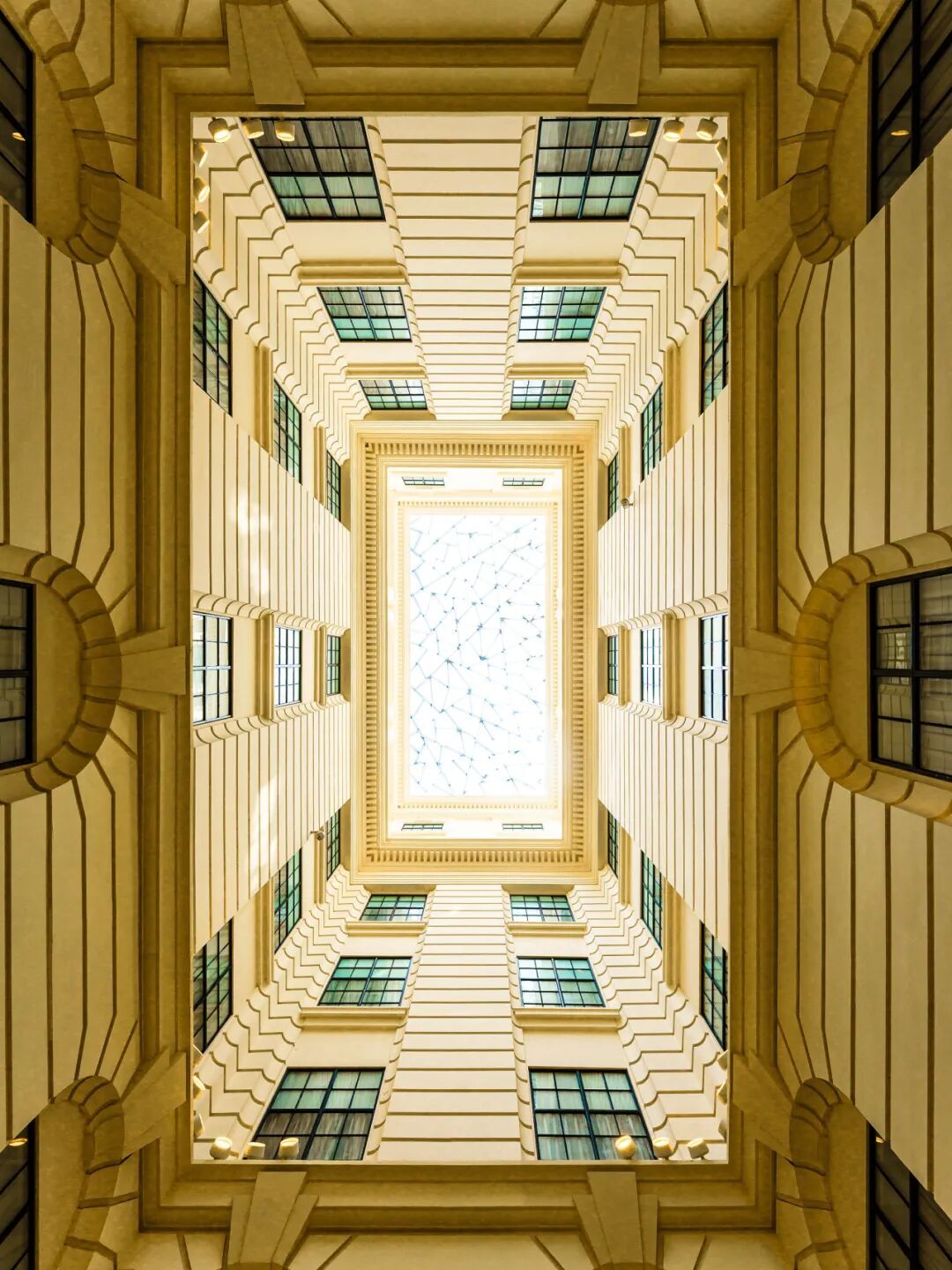 这座落成于1916 年的外滩百年地标,中庭天井的冰裂纹玻璃天花板堪称建筑艺术的神来之笔。