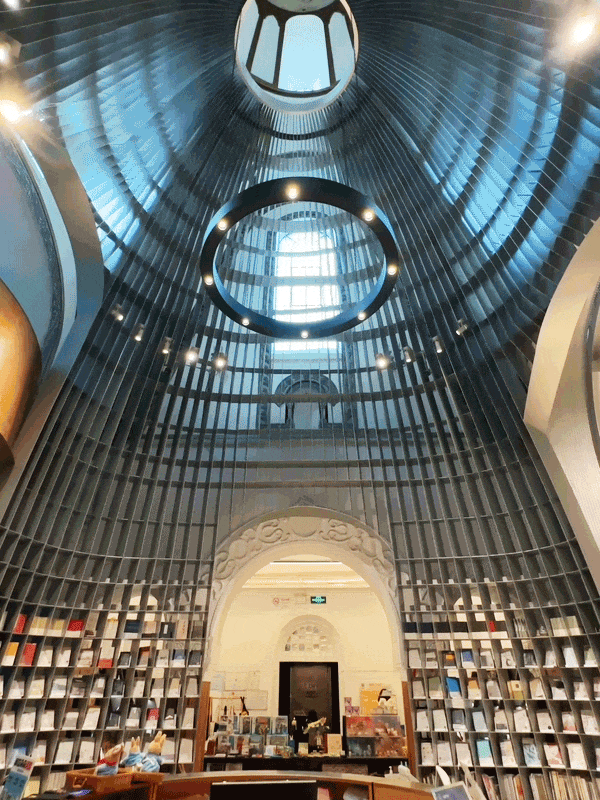 没有背板的书架让穹顶的自然光自由流淌,光影晃悠间,1920年代的建筑肌理、21 世纪初美院学生画的天主教壁画等不同年代的痕迹隐约可见。