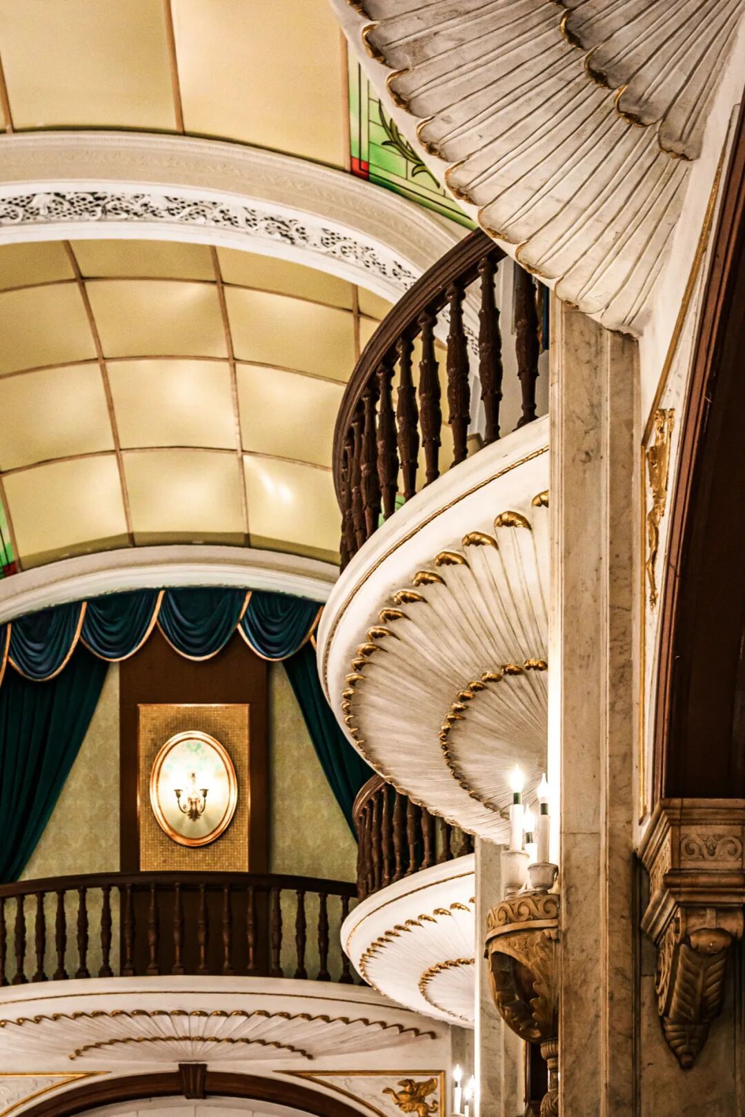 要知道,这个宴会厅当年是打通三个卧室建成的,是举办舞会时客人们彻夜派对的场所。而这面穹顶,就是当年名媛们社交时抬头就能望见的惊艳风景。