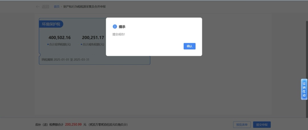 纳税人确认/修改申报表数据,确认申报表数据无误后,点击【提交】按钮,即可完成申报。