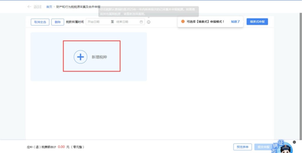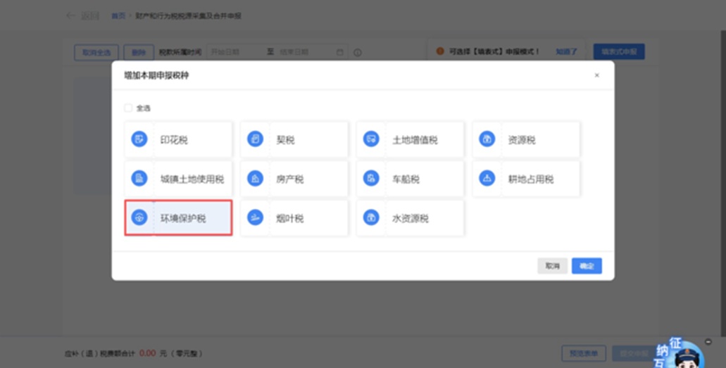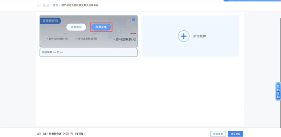 进入【财产行为税税源采集及合并申报】页面,点击新增税种,选择【环境保护税】,点击确定;