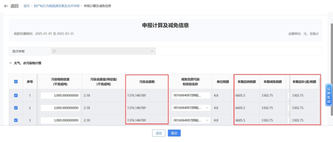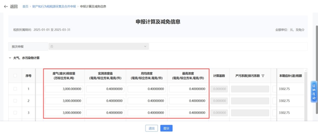 在【大气、水污染物计算】模块,系统会根据匹配规则对相关字段进行匹配,相关字段全部匹配成功的排放口,该排放口的在线监测数据会自动填入纳税人申报表;