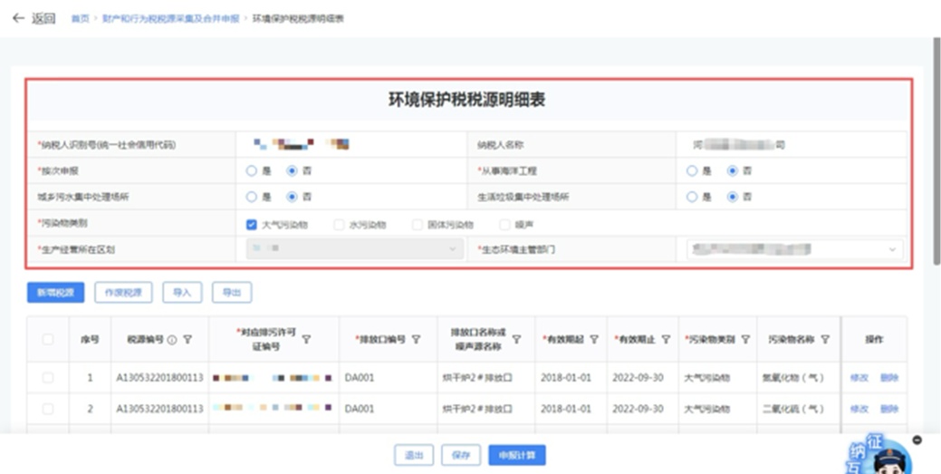 进入【环境保护税税源明细表】页面,依次填写、勾选企业基本信息,点击【新增税源】进入税源采集;