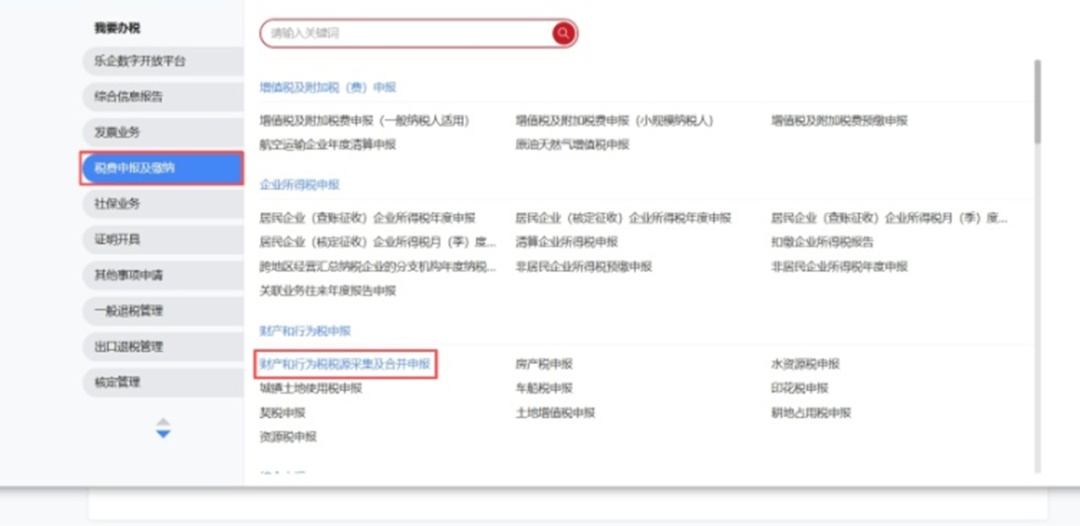 点击【我要办税】进入办税页面,点击【税费申报及缴纳】-【财产行为税税源采集及合并申报】;