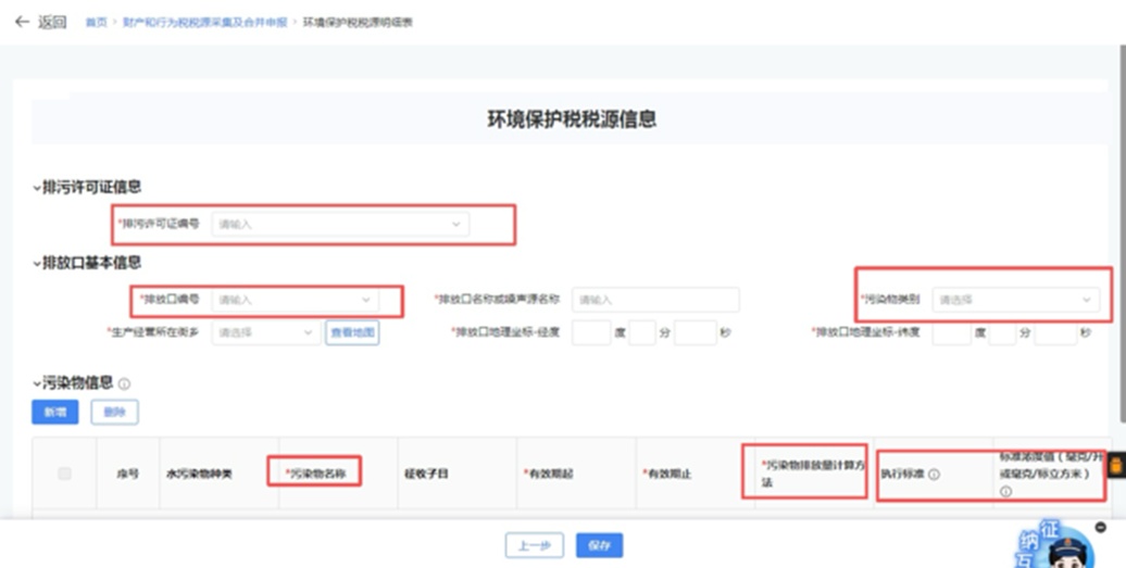 进入【环境保护税税源信息】页面,填写/勾选企业排污许可证、排放口信息,在【污染物信息】模块点击【新增】,可增加该排放口使用自动监测、监测机构监测、物料衡算、抽样测算计算方法的污染物,填报完成后点击【保存】即完成税源采集;
