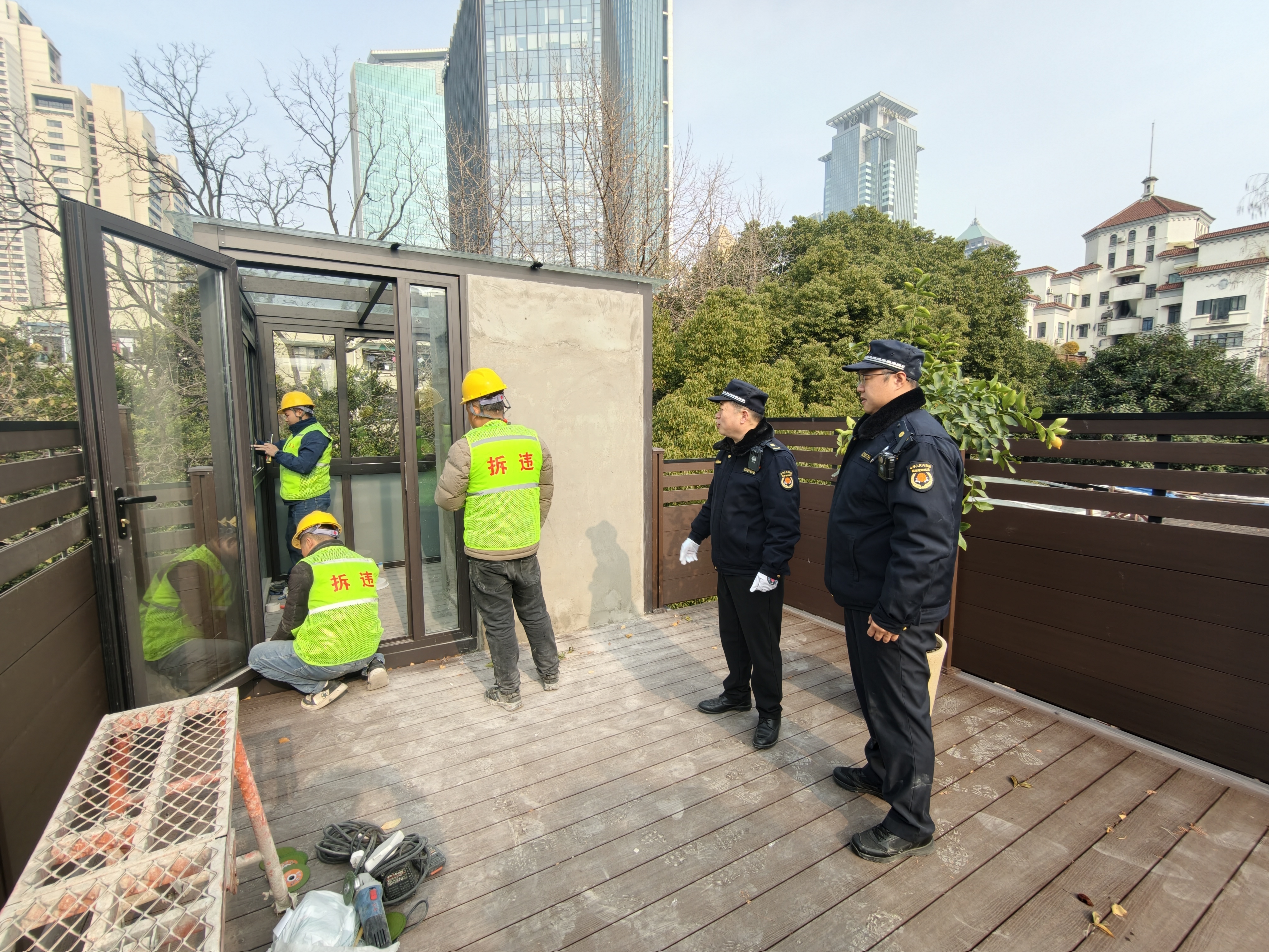 “对于新增的违法建筑,我们执法部门持续保持高压态势,绝不容忍”,近日,南京西路街道综合行政执法队接到市民投诉后迅速行动,成功拆除了威海路某小区楼顶一处新建的“阳光房”,赢得周边居民连连称赞。