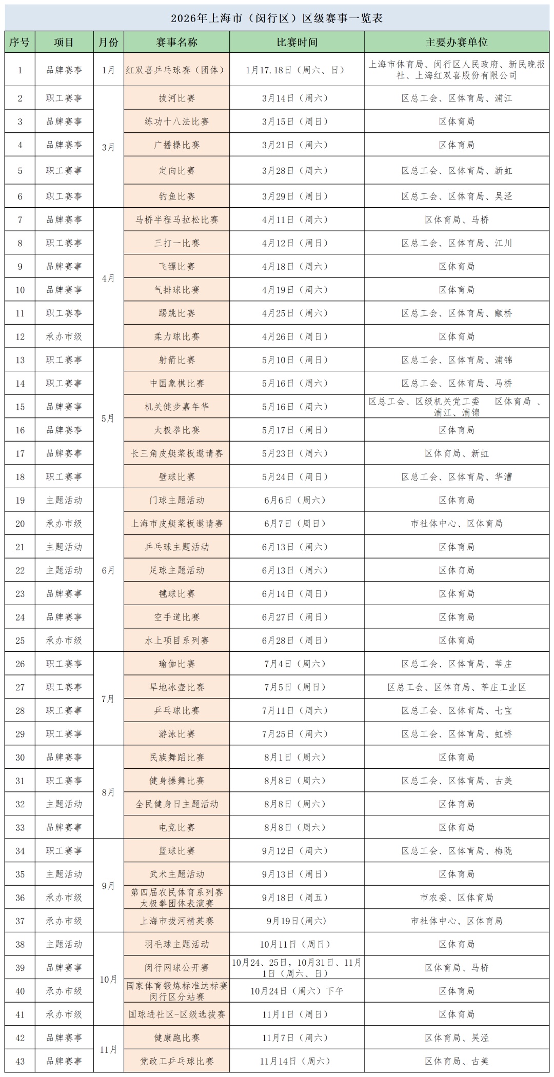近日,记者从区体育局获悉,全“闵”健身e起来精彩赛事继续,今年计划举办43场市区级群体赛事活动,除了大家耳熟能详的马桥半马、红双喜乒乓、马桥网球公开赛等品牌赛事,还将承办上海市皮艇桨板邀请赛等市级赛事,与区总工会联合举办瑜伽、壁球、射箭等职工赛事,推出乒乓、门球、足球等六大主题活动。心动不如行动赶快一键收藏赛历吧