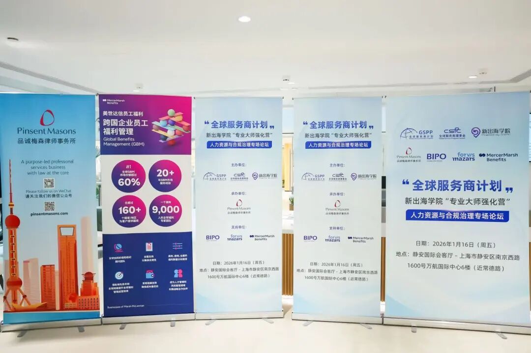 1月16日,由静安区发展和改革委员会指导,全球服务商理事会、上海静安高端服务业发展研究中心联合主办,品诚梅森律师事务所承办,联合必博、富睿玛泽、美世共同支持的“全球服务商计划”新出海学院“专业大师强化营”人力资源与合规治理专场论坛在静安国际会客厅举办。