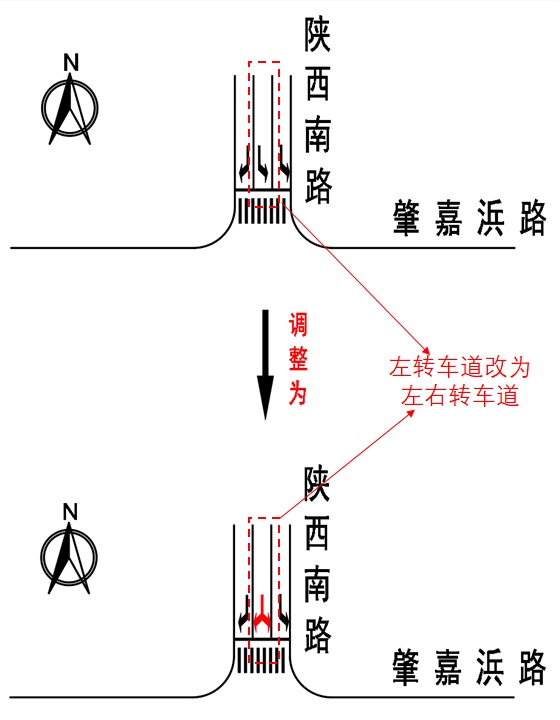 近期,市公安局交管总队与黄浦分局交管支队对肇嘉浜路/陕西南路进行踏勘及研究,据现场流量分析,该路口北进口现状车道布置与总体流量相匹配,但北进口右转车辆受限于礼让行人及非机动车通行,效率较低,车辆排队现象较为明显。