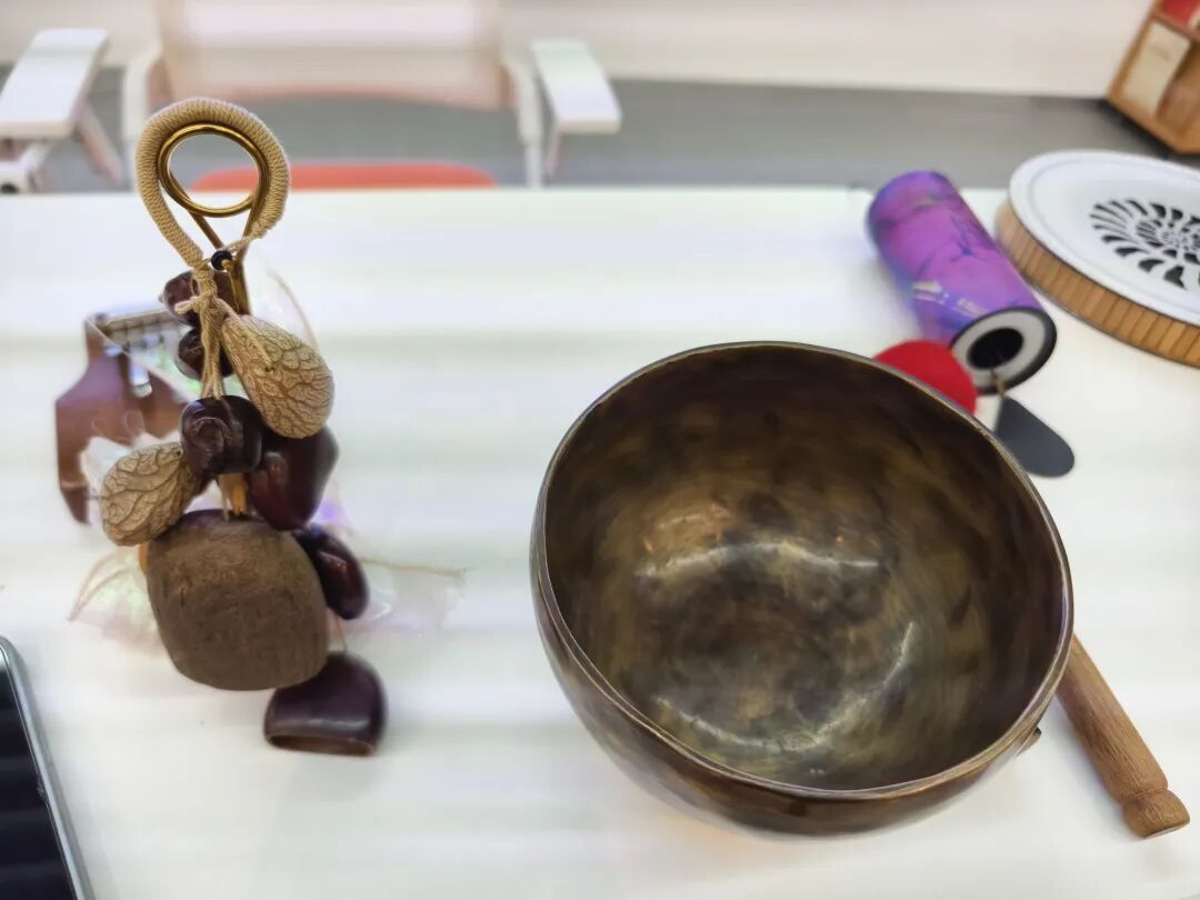 指导老师汪女士拿着做好的果壳摇铃介绍说:“它发出来的声音是一个水溪的声音,摇得稍微响一点,哗啦,哗啦哗啦!它是夹木桃(果核)做的,一般是在用在颂钵疗愈里面,大家进入冥想之后,沉睡之后,我们会用这个摇铃轻轻地把他给唤醒,因为在颂钵疗愈进入一定阶段的时候,不能一下子把他给惊醒,所以我们会用这个东西用手慢慢摇,把他给唤醒。像这个水铜铃,它的声音就是比较闷闷的。水铜铃的声音,它就是较往下走的,这两个(果壳)在一起碰撞的时候,它的声音就是闷闷的。”