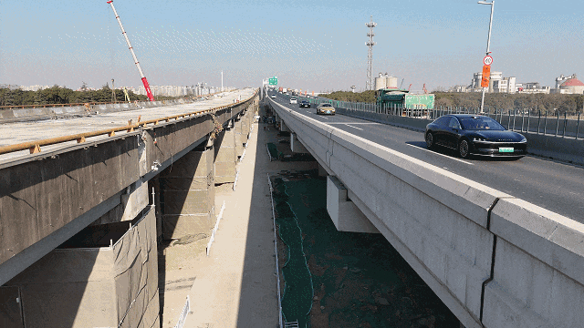 目前,工程正进行桥面附属结构改造,包括更换铺装、防撞墙及病害整治。改建完成后,奉浦大桥(西桥)将承担闵行往奉贤方向的上行交通,新建的奉浦东桥则负责反向通行,实现双向分流。