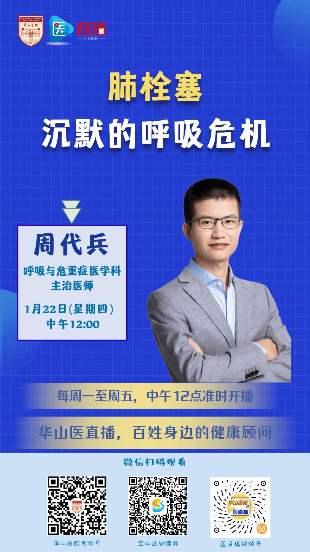 一个看似微小的血栓,一旦脱落并随血液流入肺动脉,就可能瞬间阻断生命的气体交换通道,引发猝不及防的呼吸衰竭与心脏骤停——这就是肺栓塞,一种起病隐匿、进展迅猛、致死率极高的危急重症。本期医直播,复旦大学附属华山医院呼吸与危重症医学科主治医师周代兵,将揭开这位“沉默杀手”的面纱。