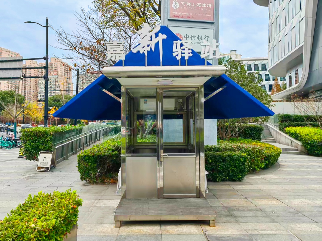嘉“新”驿站的前身,原是金融街(海伦)中心步行出入口处的一处闲置保安亭。为更好地利用空间,物业提出升级改造的需求后,嘉兴路街道党群服务中心与金融街(海伦)中心党委共同策划,将其改造为面向新就业群体的免费休息站。