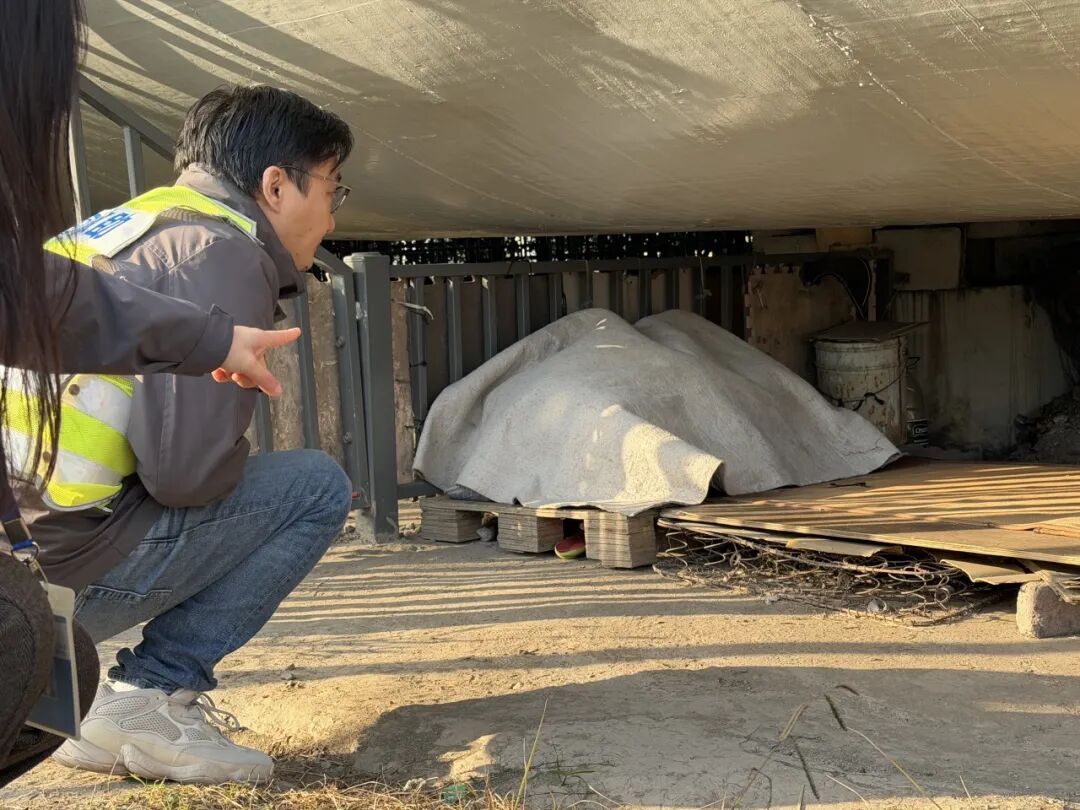 巡查首站来到翔殷路一处桥洞下。这里环境阴冷,但一处角落被收拾得异常“规整”:几块薄木板简易拼搭成“床铺”,上面铺着竹席,旁边的生活用品被一块棉布仔细地盖着,抵御着灰尘与湿气。工作人员赵文娟一眼就认出,这是流浪人员小朱(化名)的“家”。