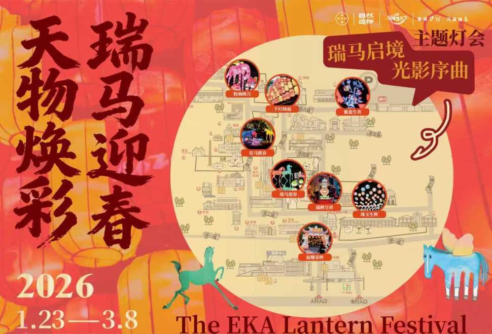 1月23日,随着一组组马形彩灯在汇聚多元现代建筑风格的“露天建筑博物馆”内亮起,由沪东新村街道与EKA·天物联合呈现的“天物焕彩·瑞马迎春”主题灯会启幕,将延续至3月8日,为市民与游客带来为期一个多月的非遗光影盛宴。