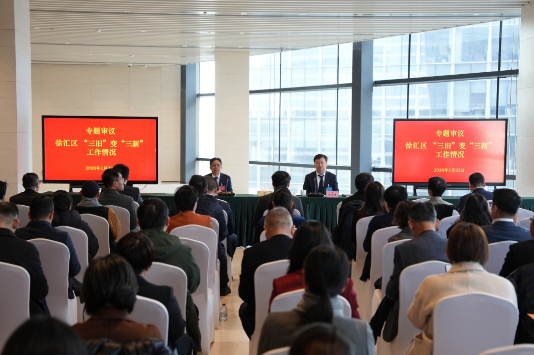 1月22日上午,徐汇区第十七届人民代表大会第九次会议举行专题审议会。区人大常委会副主任徐国文主持会议。围绕“三旧”变“三新”工作推进情况,副区长邓大伟和区人大代表面对面交流,问需于民、问计于民、问效于民。