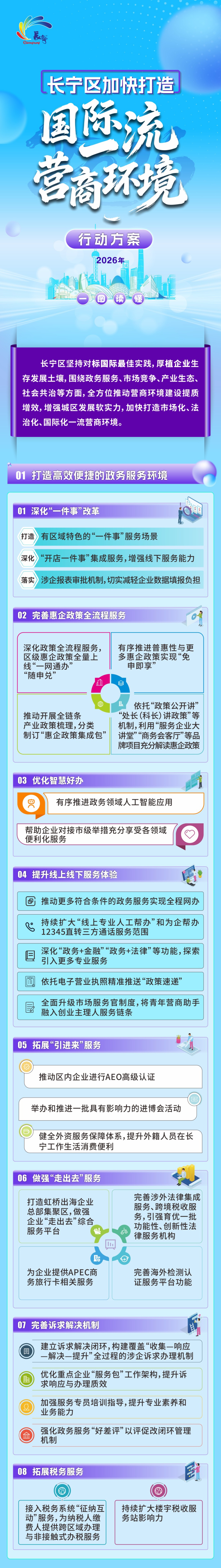 长宁区2026年优化营商环境暨促进民营经济高质量发展大会今天(1月28日)举行。会上,《长宁区加快打造国际一流营商环境行动方案(2026年)》发布,并推出2026版八张特色牌。“十五五”开局之年,长宁如何高质量做好营商环境工作,“宁宁”带你一图读懂↓