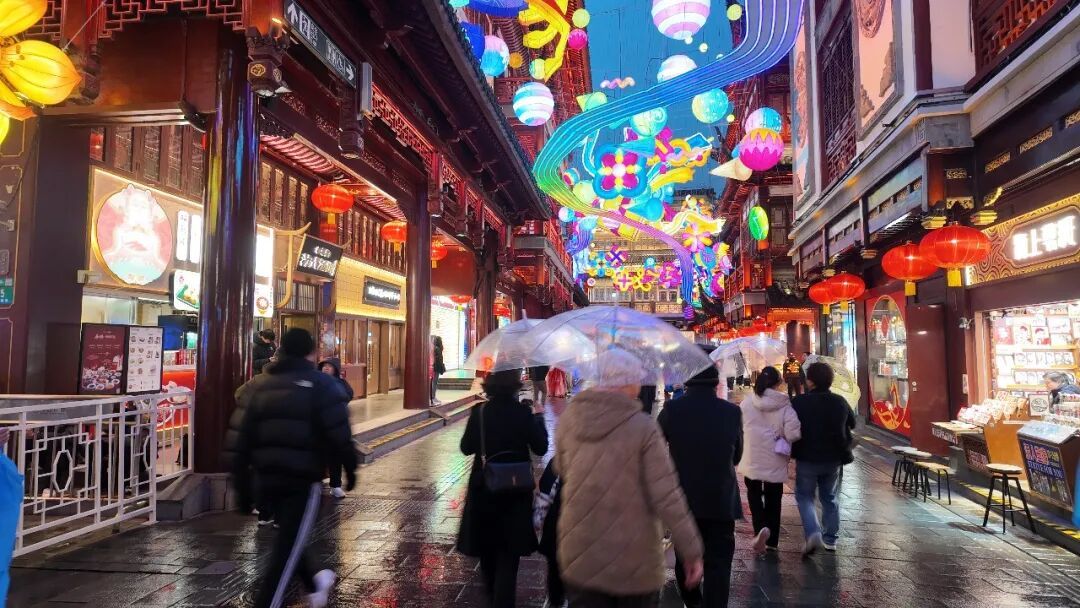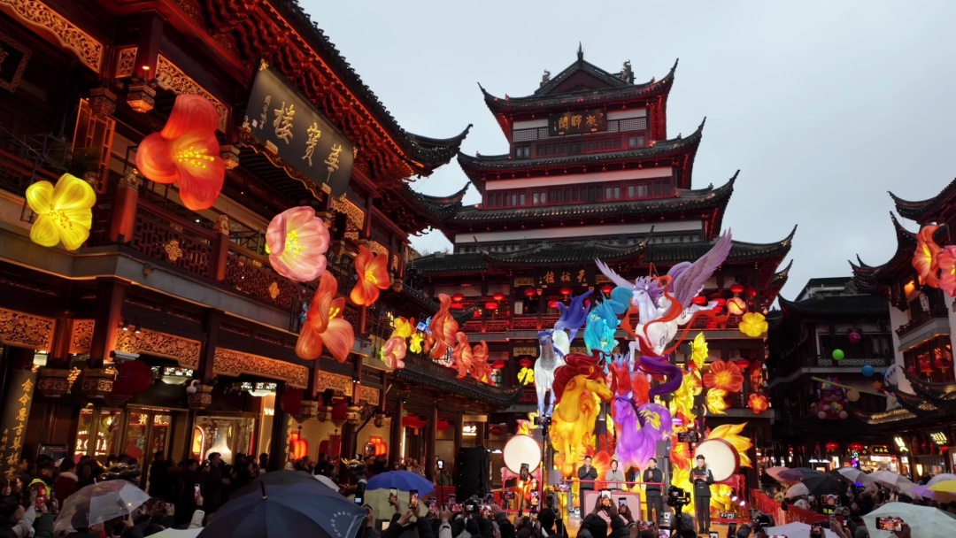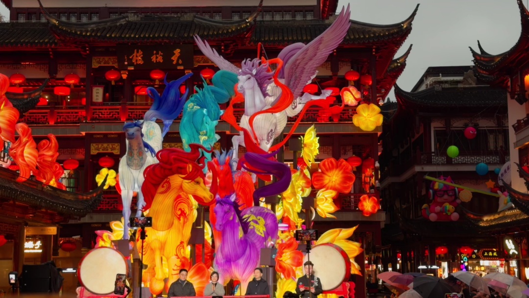 作为亮灯起点的豫园民俗艺术灯区,今年推出“山海奇豫记旷野篇”,以“以梦为马,旷野生花”为主题。中心广场“骏驰九州”、九曲桥“马跃星河”等大型灯组,巧妙融合非遗灯彩与数智光影,营造出可步入、可触摸的东方美学意境,让人仿佛置身于梦幻世界。