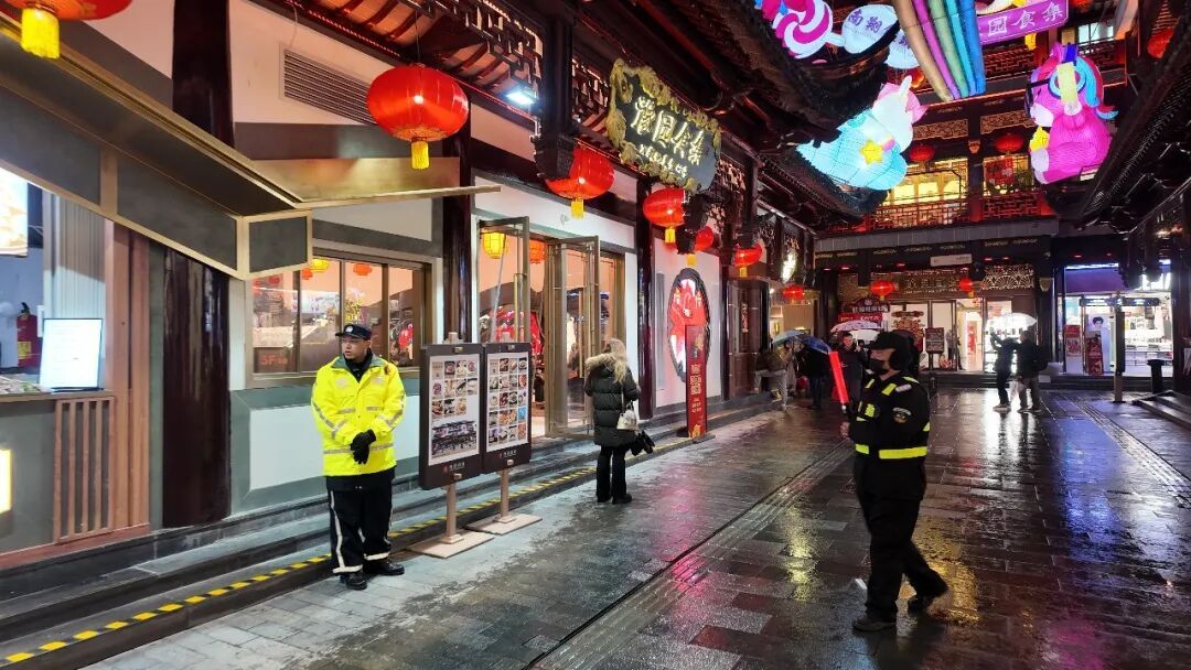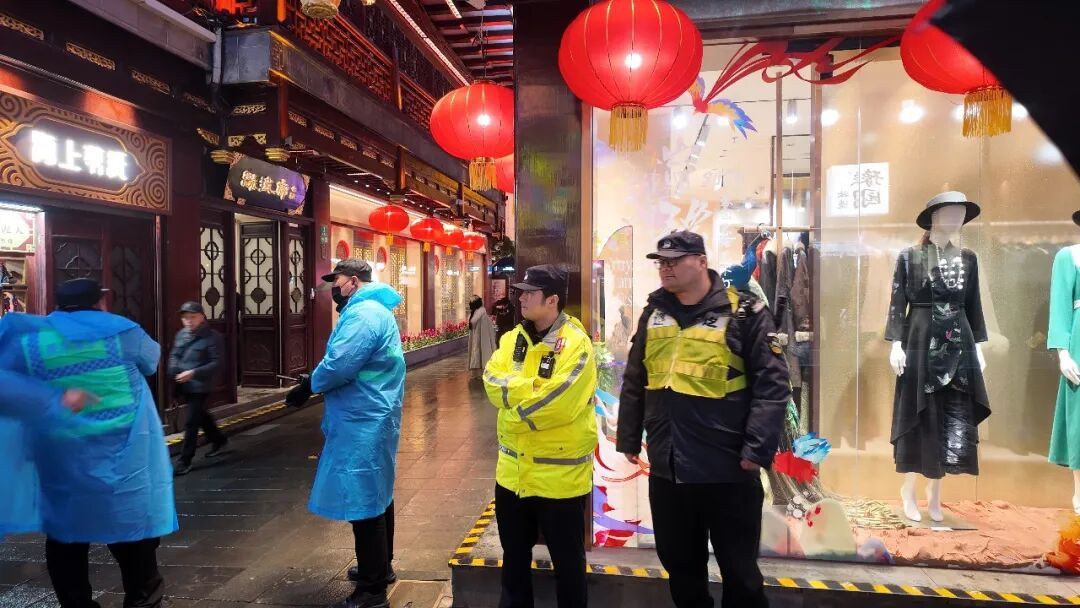 据了解,为确保灯会期间的治安和交通秩序,黄浦公安分局提前制定了详细的安保方案,并部署了充足警力。黄浦公安分局豫园派出所责任区警务队队长陶清源介绍道:“在园内,当瞬时客流达到15000人以上时,我们会采取‘三进五出’的措施,开启蛇形通道,让整个园内形成大单向循环。同时,在园内的每一个风险点位,都安排了民警、特保和平安志愿者进行疏导和管控,确保大家能够平稳有序、安全地游园。在灯会周边区域,也有平安志愿者、特保和民警共同进行巡逻值守,为大家营造一个平稳、安全、有序的环境。”