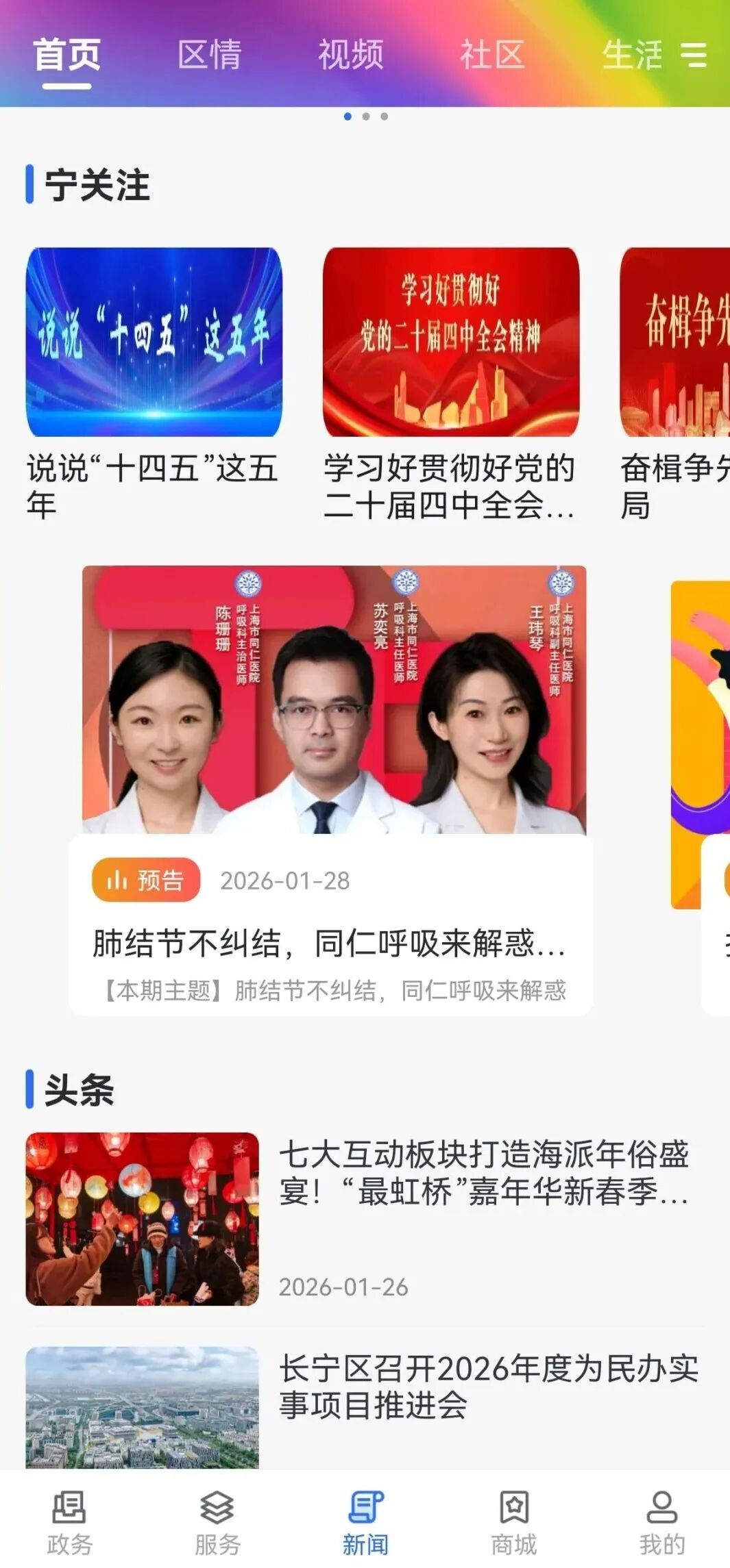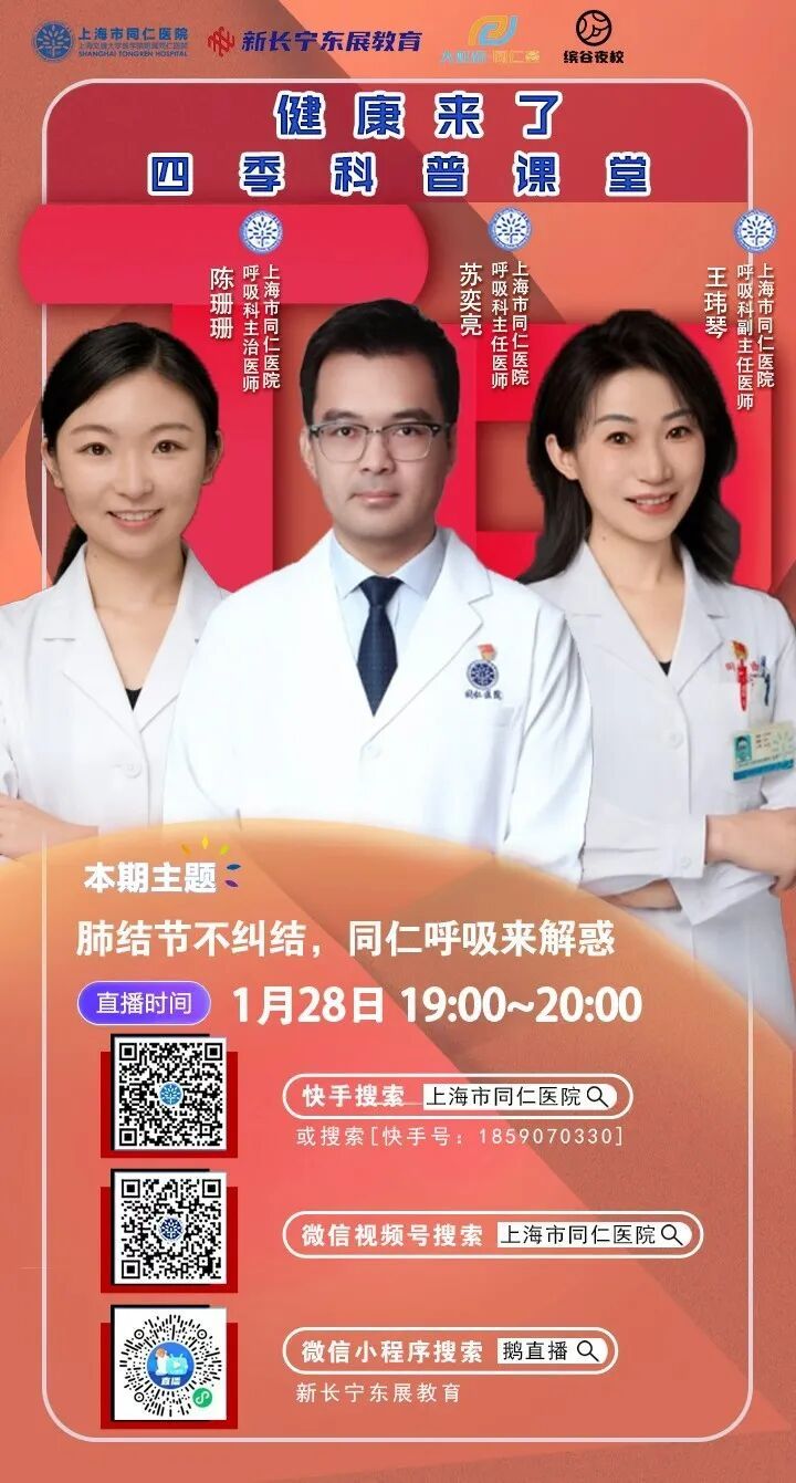 今天(1月28日)19:00—20:00,“上海长宁”App将与上海市同仁医院“大虹桥·同仁荟健康直播”共同直播:肺结节不纠结,同仁呼吸来解惑。