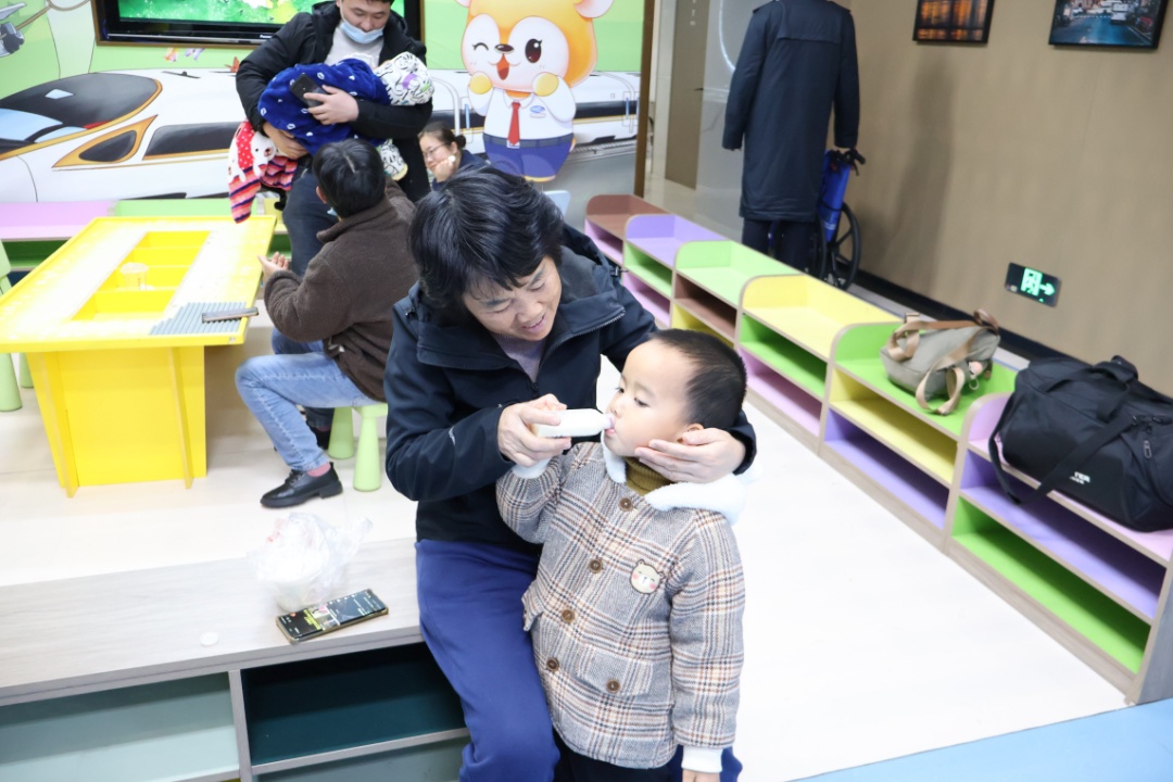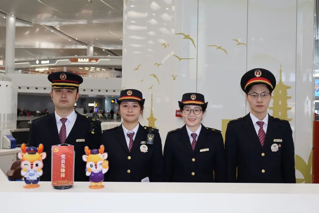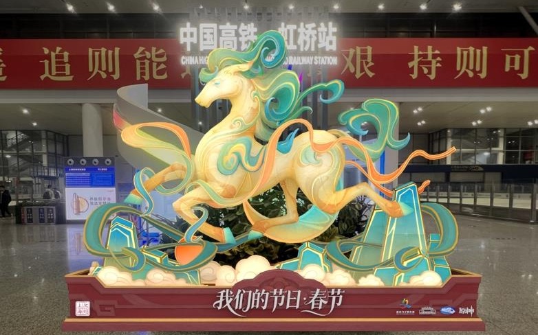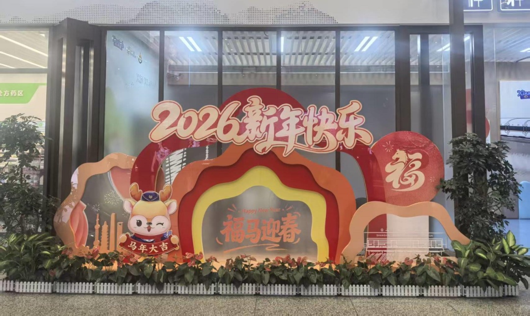 各站区悬挂红灯笼、中国结,设置春节主题景观、马年旅客打卡点,广播播放年味乐曲,显示屏滚动新春视频