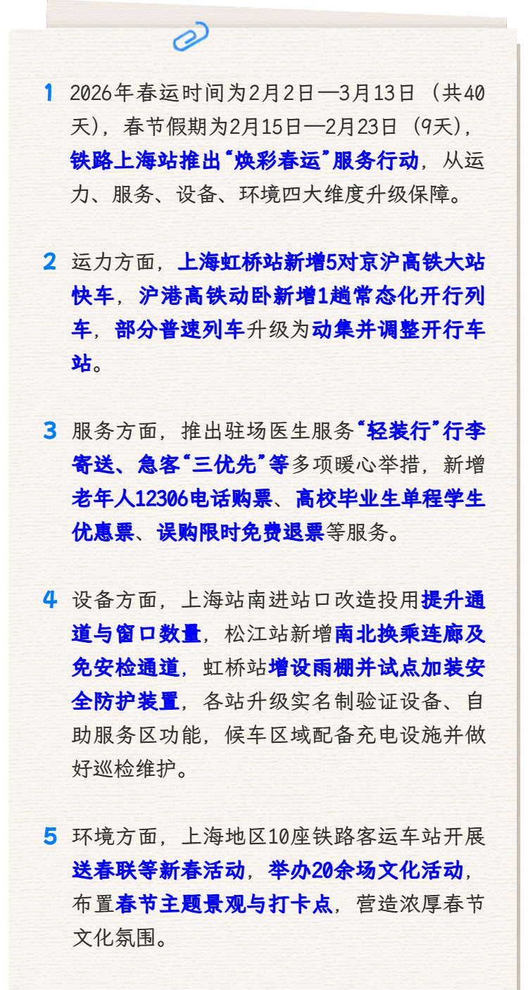 铁路上海站介绍,2026年春运大幕将启,面对史上最长春节假期和超大客流压力,铁路上海站推出“焕彩春运”服务行动,从运力、服务、设备、环境四大维度升级保障,让每一位旅客的回家路都温暖顺畅。详见↓