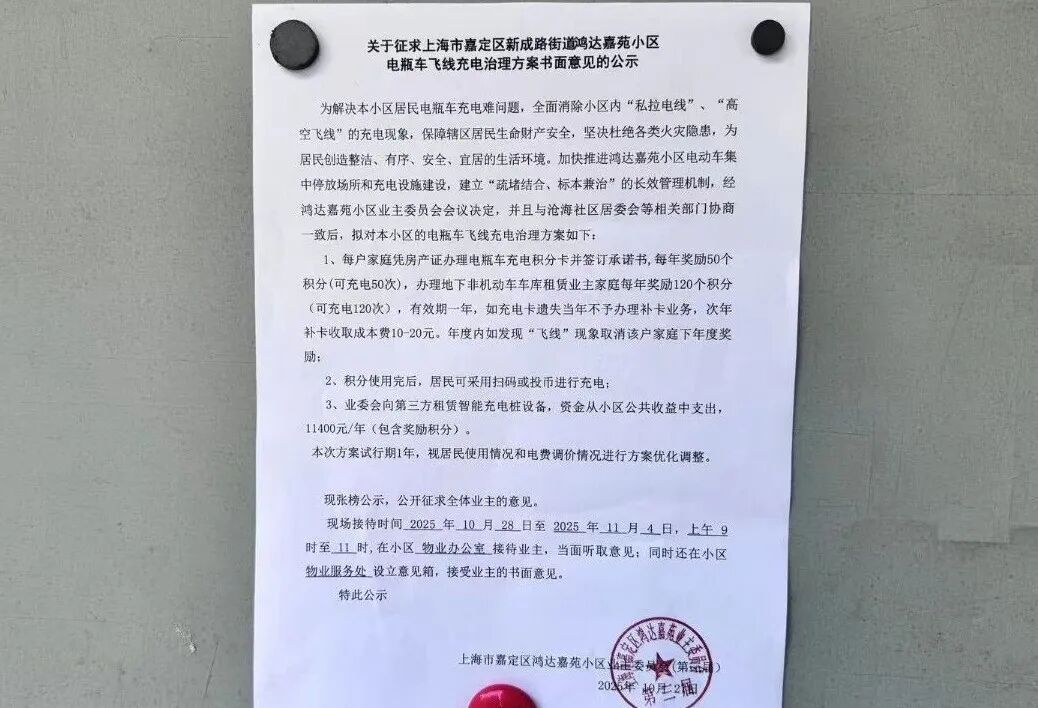 “以奖代补”具体如何操作?居民自愿签署安全充电承诺书后,即可领取充电积分卡,本年度内可享受免费充电次数,电费由业委会从公共收益中支出。免费额度用完后,居民可通过扫码或投币继续充电,有效期一年。