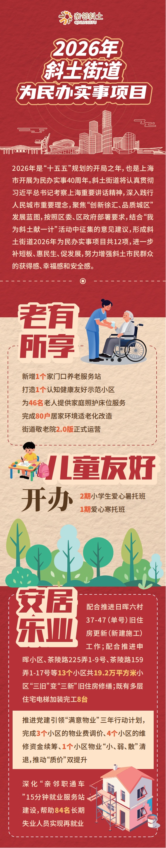 记者获悉,2026年,斜土街道聚焦“创新徐汇、品质城区”发展蓝图,按照区委、区政府部署要求,结合“我为斜土献一计”活动中征集的意见建议,形成街道层面12项为民办实事项目、片区层面10项“一片区两实事”项目及居民区层面34项微实事(微治理)项目,并将继续奋力打造“城市水岸.亲邻斜土”,为居民创造更加美好的生活环境。