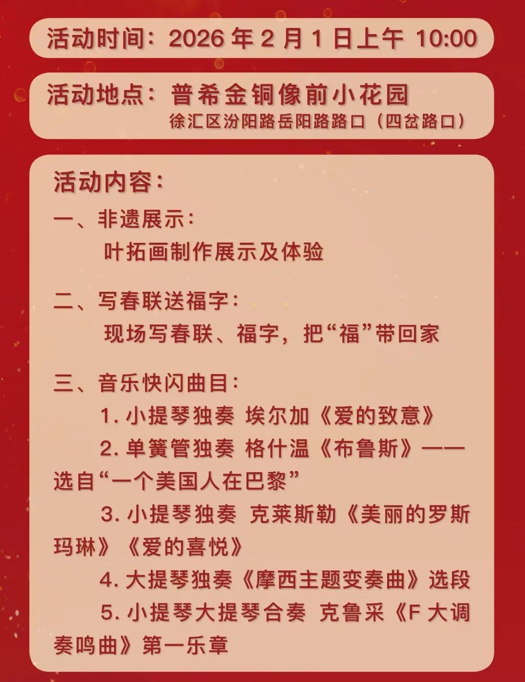 当岳阳路的暖阳遇上悠扬旋律,当普希金的诗句撞上中俄双语的温柔,这个周末,邀你赴一场治愈又浪漫的冬日之约。 2月1日10:00 街头音乐快闪+非遗互动