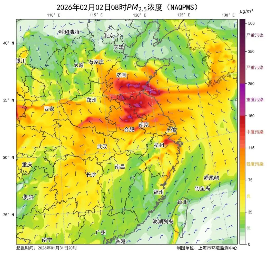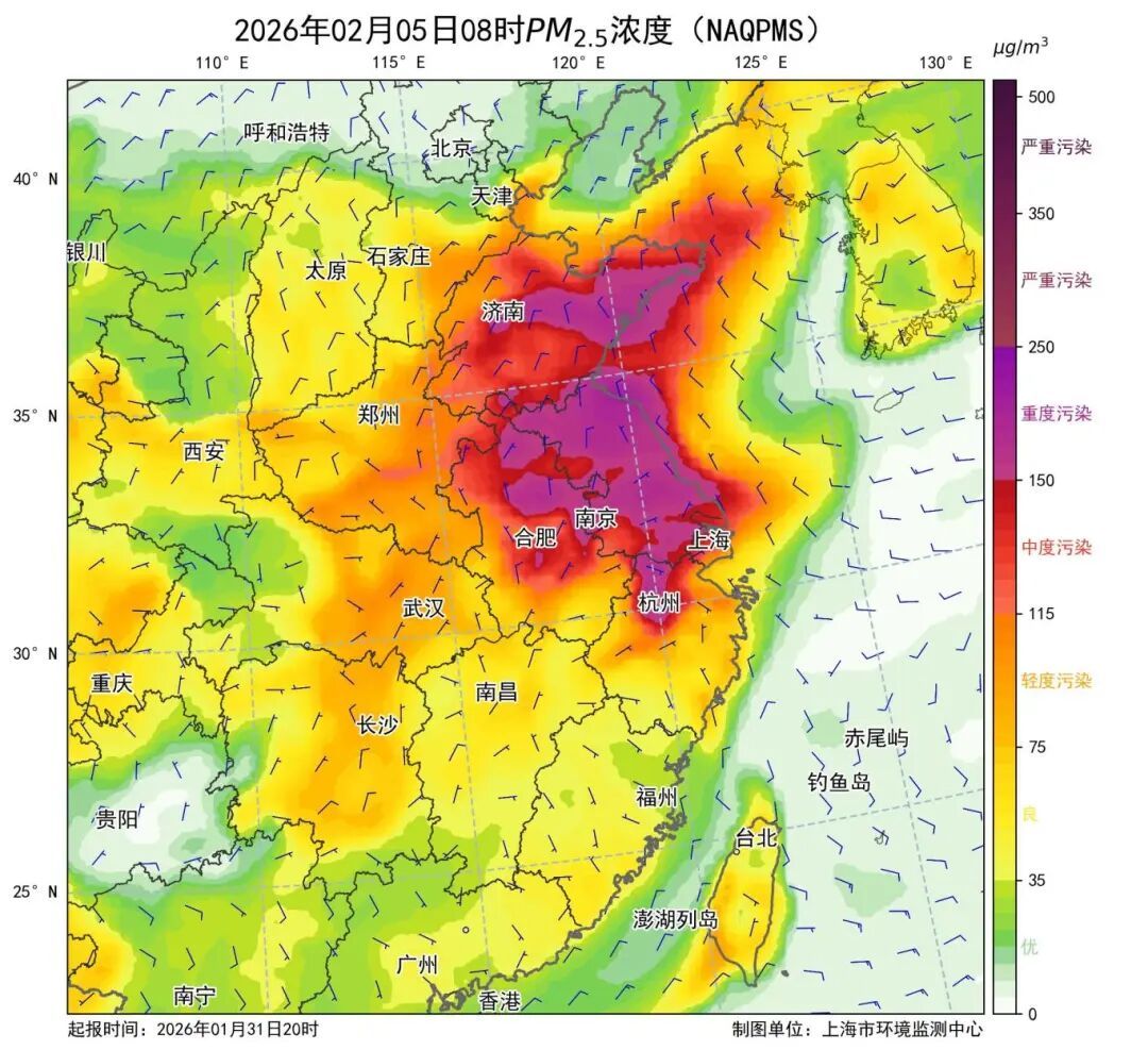 2日8时、23时及5日8时、6日8时PM2.5浓度预报结果