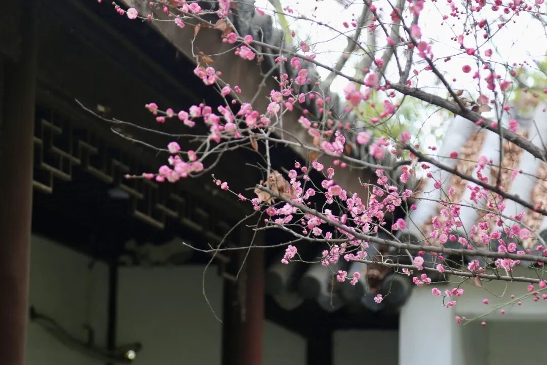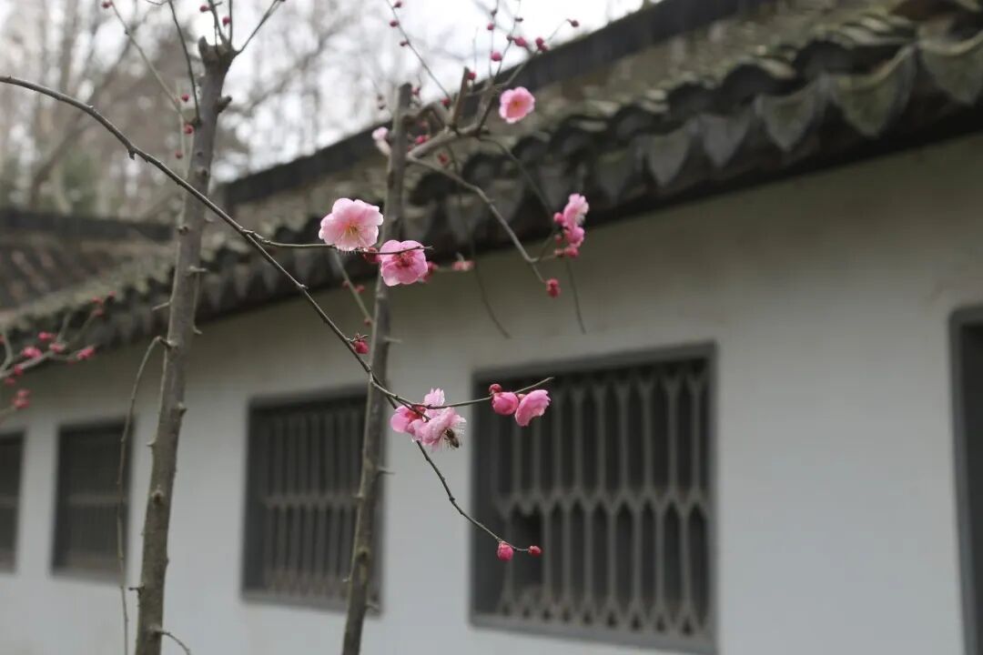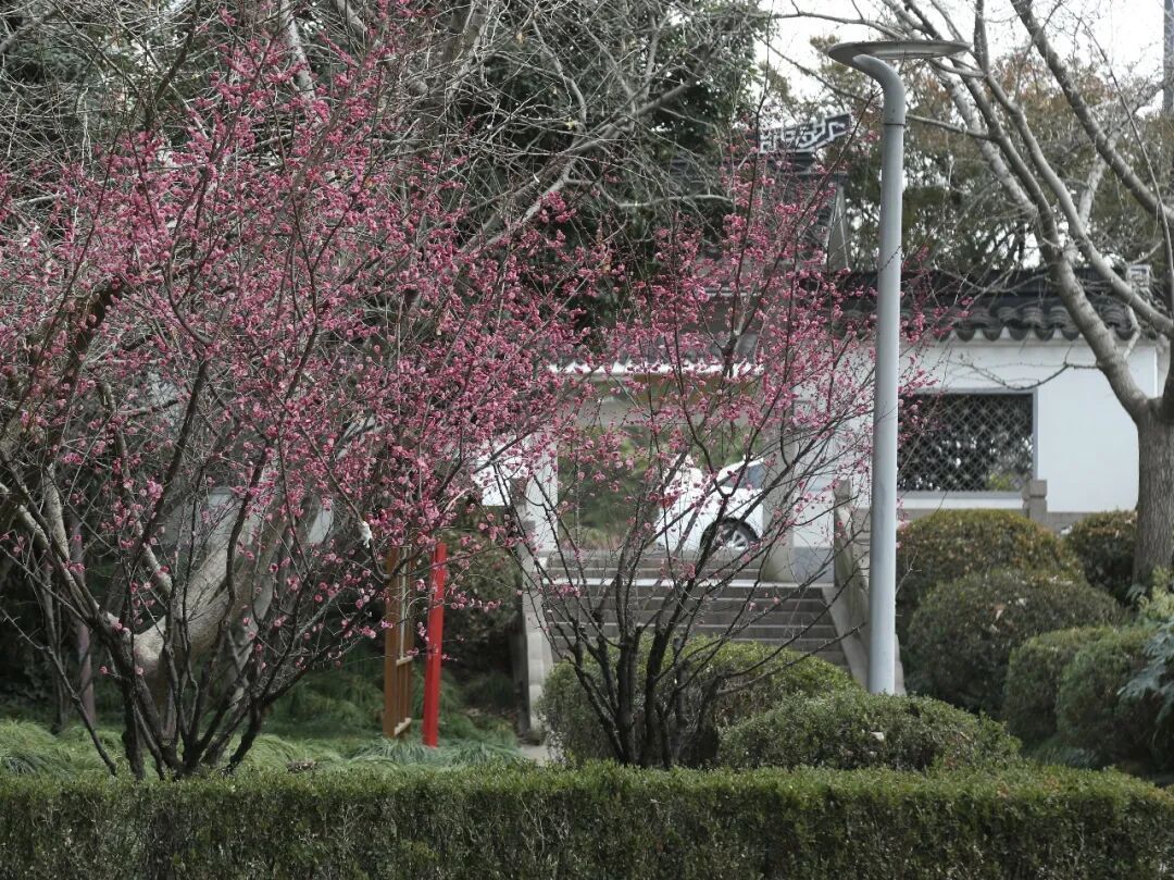 作为上海五大古典园林之一,秋霞圃内的第一波梅花也已悄然绽放。与公园成片梅林不同,这里的梅花零星点缀在古典建筑之间。枝上的梅花有的还是花骨朵,娇嫩欲放;有的已展开两三片花瓣,露出嫩黄花蕊。它们与园林中的亭台楼阁、飞檐翘角相映成趣,别有一番意境。