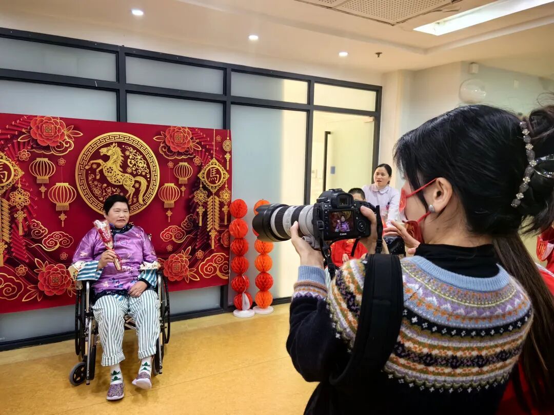 作为迎新喜乐会的重要环节,现场惊喜不断。病区的活动室临时变成了“专属更衣室”,一整排衣架上挂满了色彩鲜艳的唐装,供老人们自由挑选。专业化妆师耐心细致地为老人们描眉、涂口红,再搭配上喜庆的帽子、围巾、发箍和闪亮的灯牌,老人们瞬间精神焕发。专业摄影师则用镜头捕捉下这一个个幸福瞬间。新年写真拍摄是豫园社卫一年一度的保留节目,今年已是第四个年头,老人们对此都满怀期待,因为这些照片可以打印出来留作纪念,是幸福生活的见证。