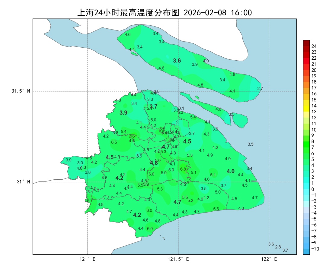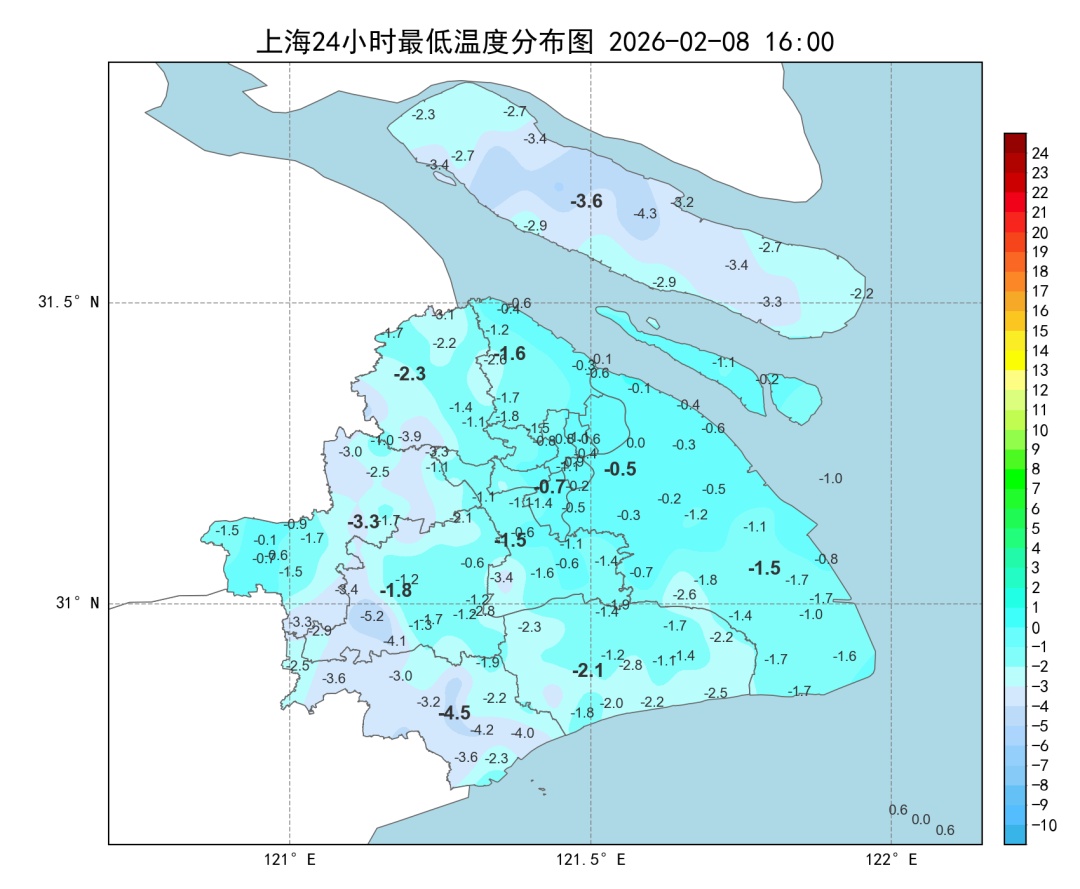 今天上海是晴到多云的天气。早晨受辐射降温影响,全市最低气温都跌至冰点以下,其中市区徐家汇站是-0.7 ℃,郊区中金山最低,为-4.5℃。白天虽有阳光相伴,但气温回升有限,全市最高气温普遍在3~5℃之间,市区徐家汇站是4.7℃。户外体感寒冷。